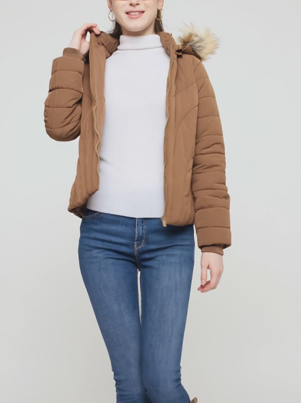 Shop the Madame Brown Quilted Hooded Jacket for women. Featuring a warm brown hue, quilted design, and a cozy hood, this jacket offers comfort and style for winter. Perfect for casual outings, layering, and everyday cold-weather fashion.