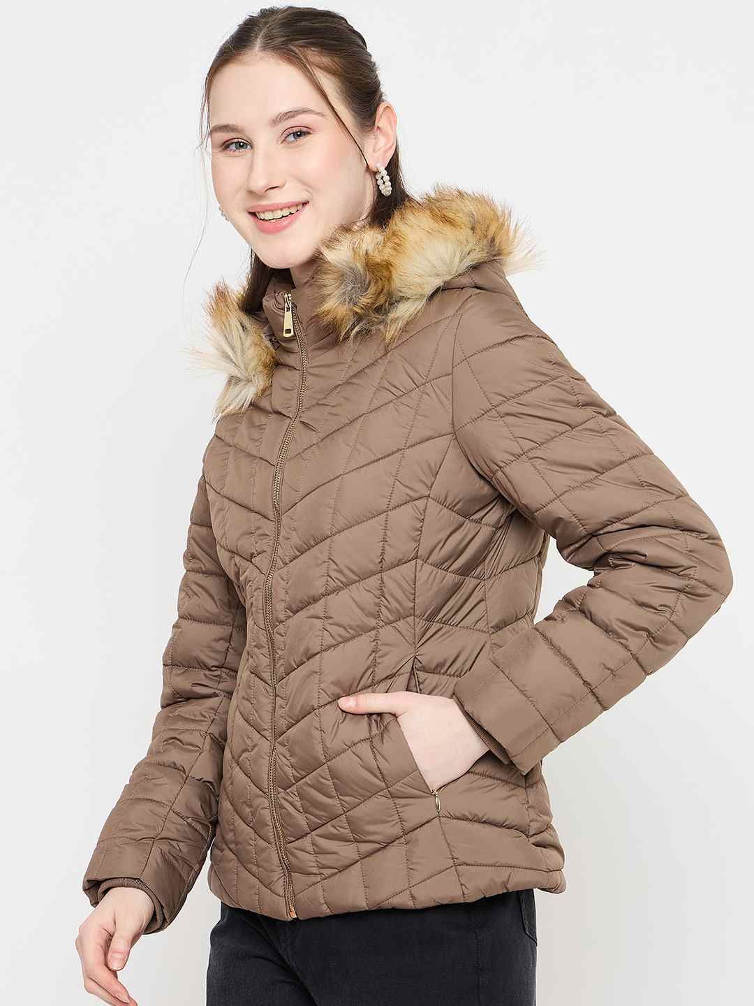 Shop the Madame Brown Colour Quilted Fur Hood Jacket for women. Featuring a playful Brown colour design, quilted pattern, and cozy fur-lined hood, this jacket blends warmth with whimsical style. Perfect for casual winter outings, layering, and everyday cold-weather fashion.