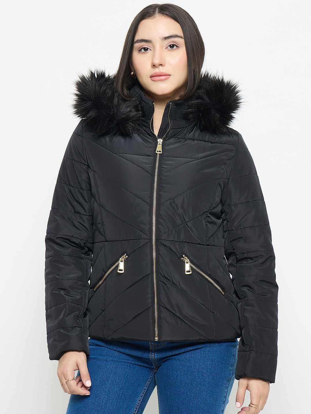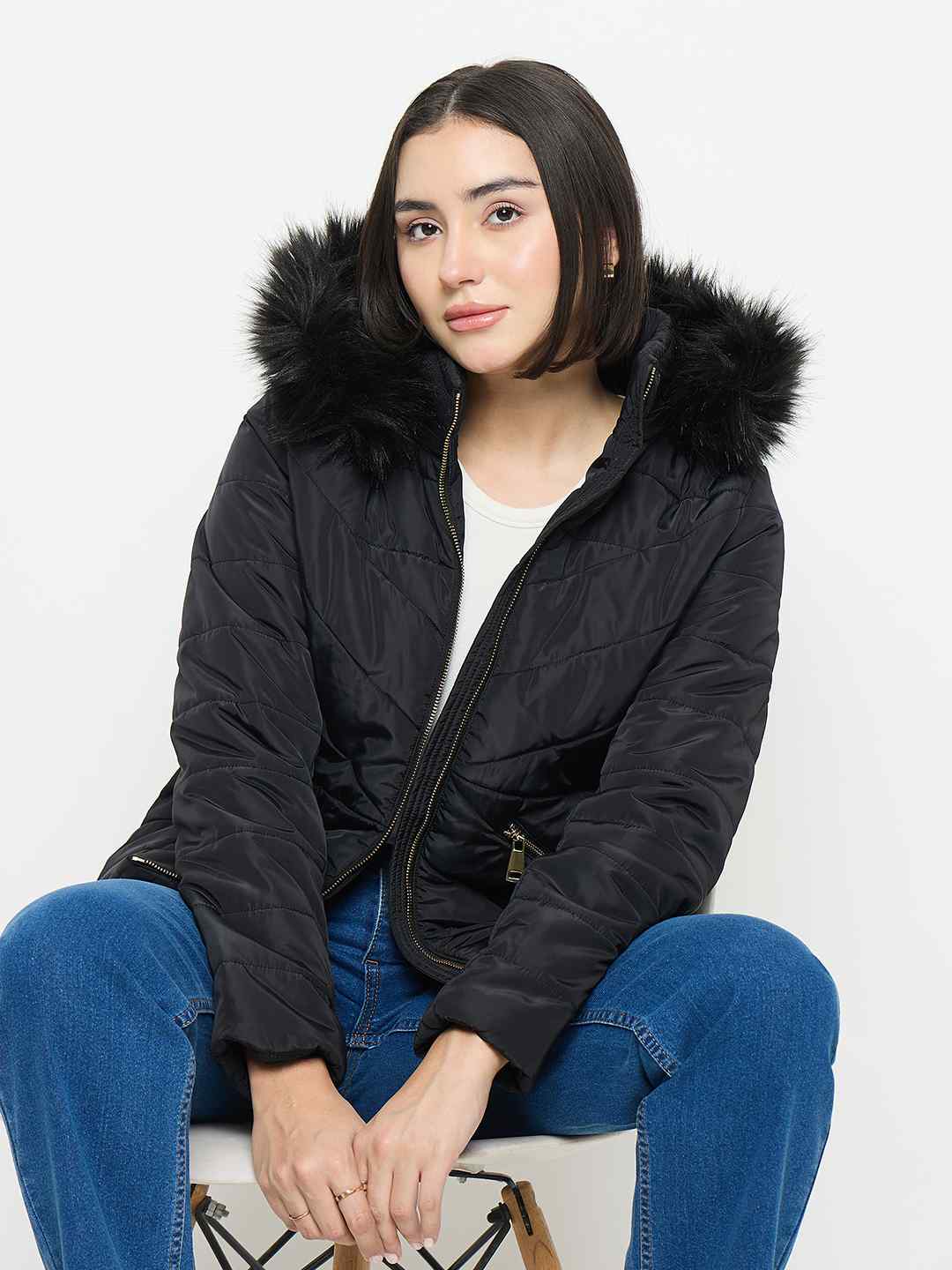 Stay warm and stylish with Madame black quilted fur jacket. Its plush texture and chic design make it perfect for chilly days, effortlessly elevating your casual or evening outfits with a touch of cozy elegance.