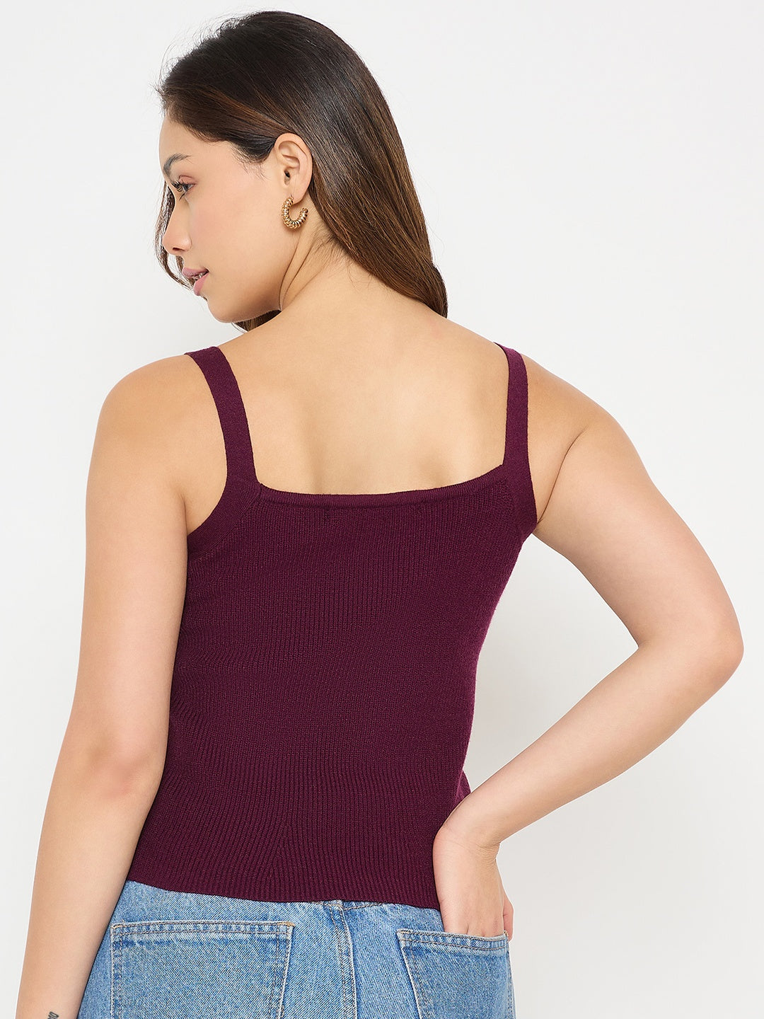 Add a rich, elegant touch to your wardrobe with this wine knit crop top from Madame. Designed with a delicate camisole neckline and a flattering cropped silhouette, it offers a sleek and contemporary look. Crafted from soft knit fabric, this versatile piece is perfect for layering or styling solo for chic day-to-evening outfits.