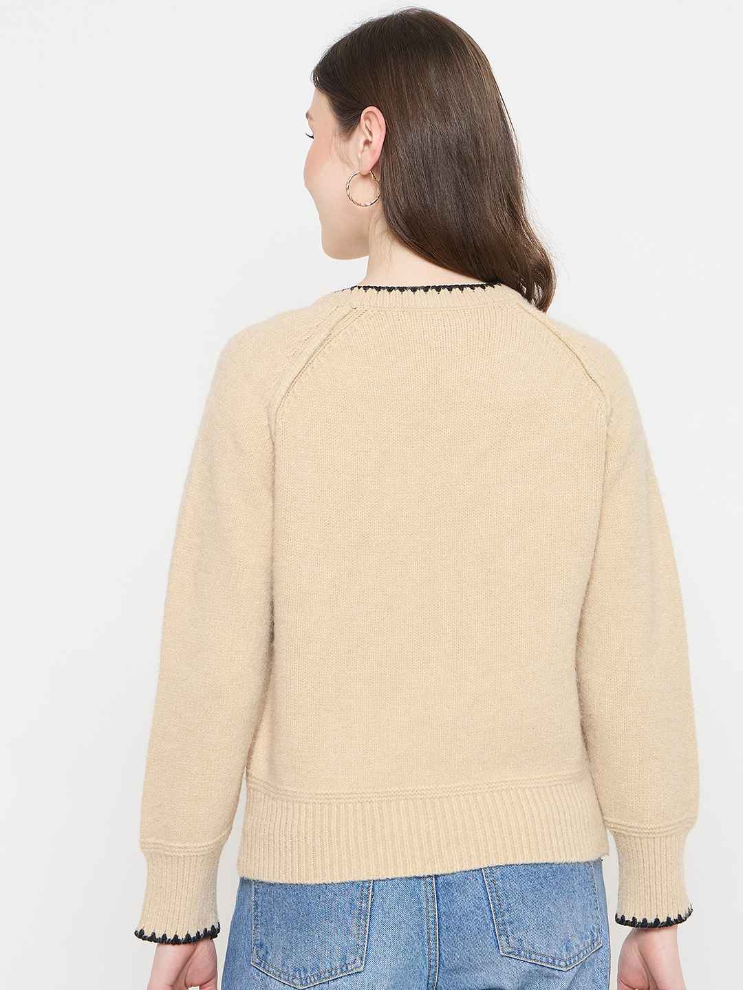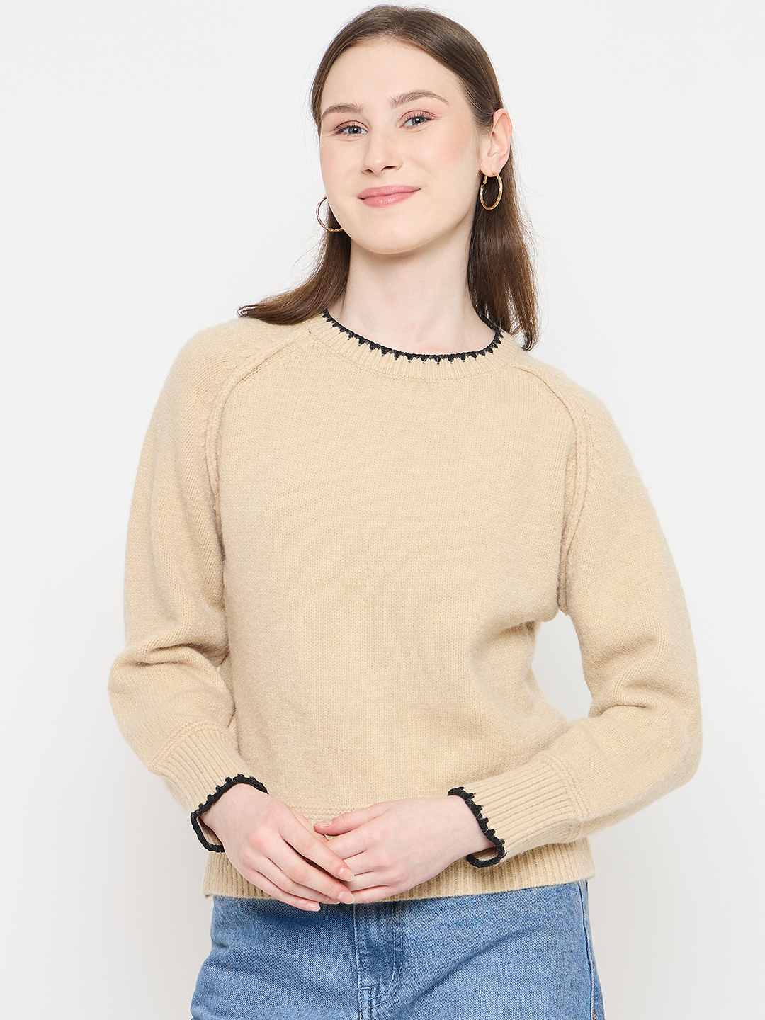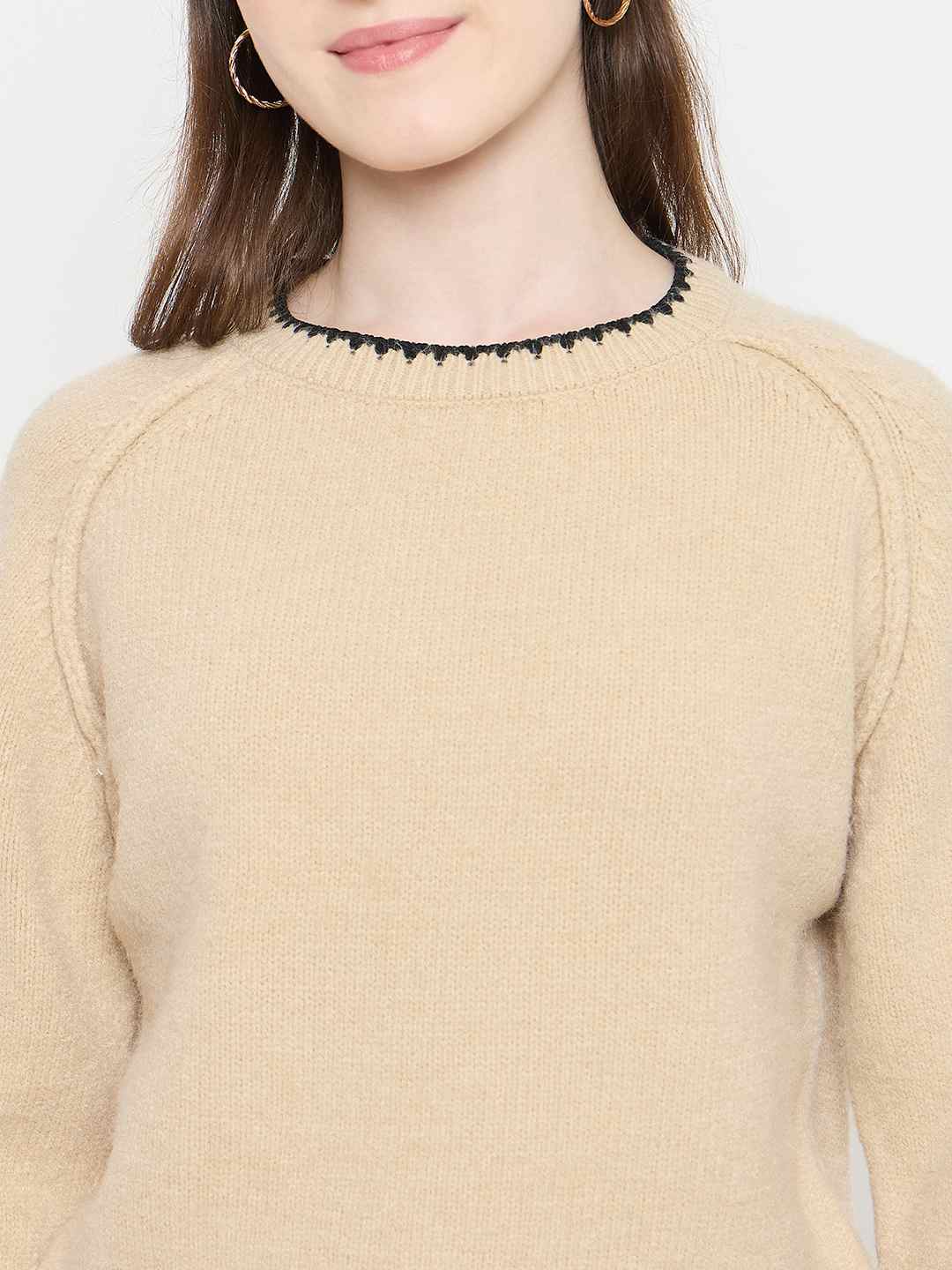 Madame Crew Neck Beige Sweater for women soft knit fabric, crew neckline, raglan sleeves, comfortable fit, ideal for casual wear and winter layering.