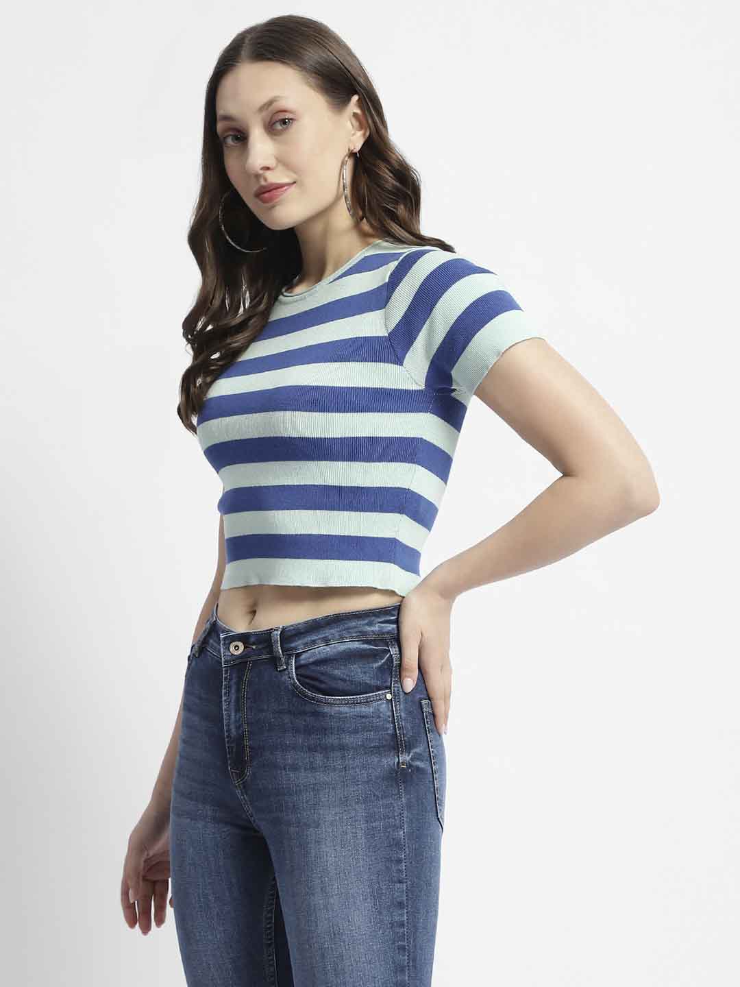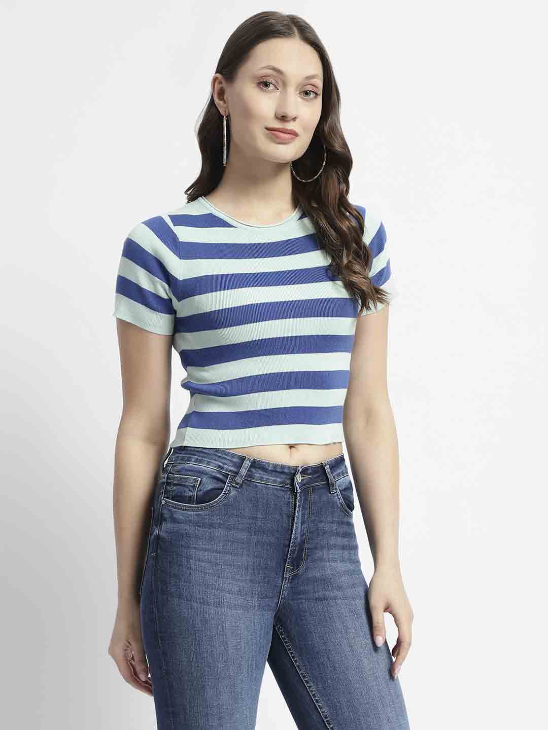 Madame Crew Neck Blue Striped Half Sleeve Crop Top