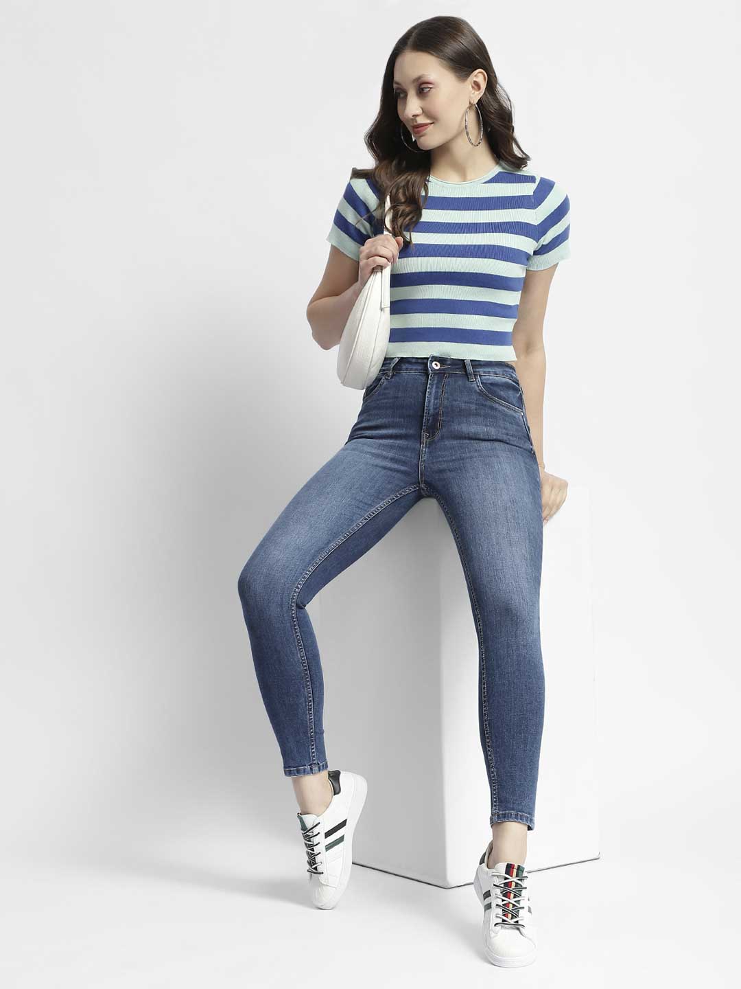 Introducing Madame Crew Neck Blue Striped Half Sleeve Crop Top. With its captivating blue stripes and flirty cropped cut, this top exudes playful charm. Whether you're lounging poolside or exploring the city streets, it effortlessly elevates your look with a hint of coastal cool. It is crafted for comfort and versatility. It pairs perfectly with anything from high-waisted jeans to flowy skirts.