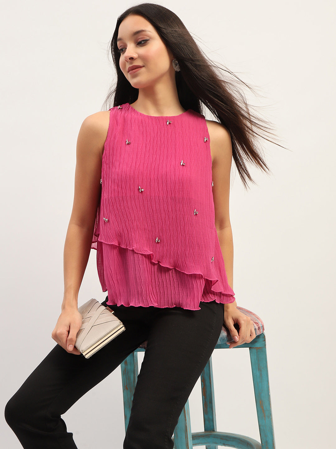 Crafted from a lightweight, breezy fabric, it features a playful, tiered design that flows effortlessly with every move. The textured pleats add a touch of sophistication, while the crew neckline keeps things classic and comfy. It is perfect for both daytime outings and evening adventures. Pair it with your favorite jeans for a laid-back look, or dress it up with a chic skirt for date night.