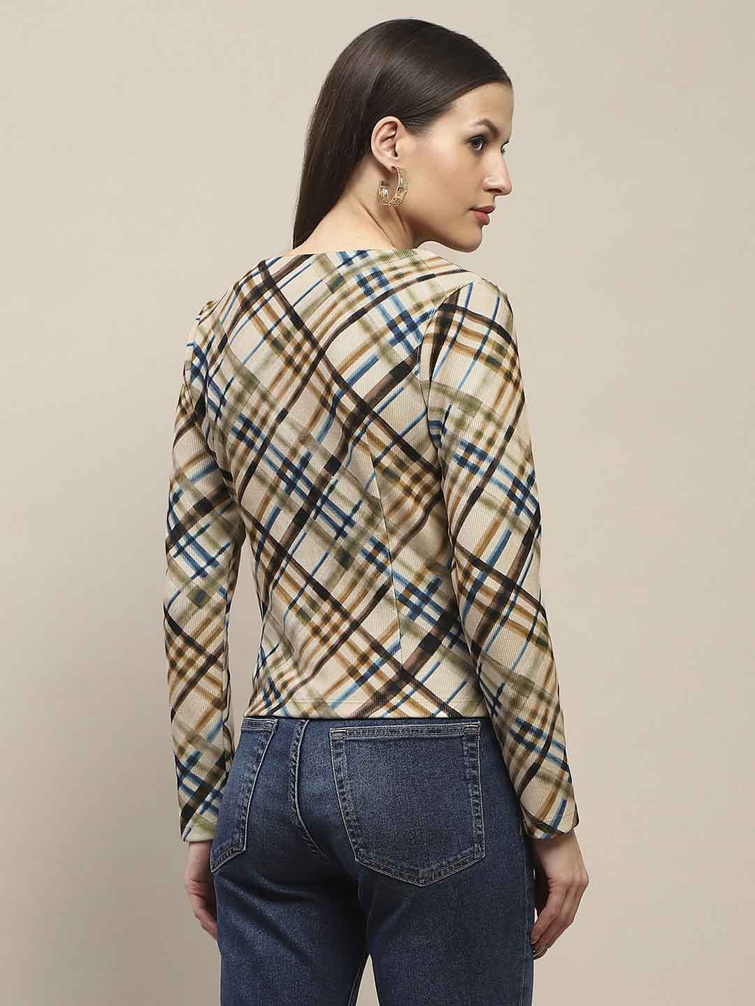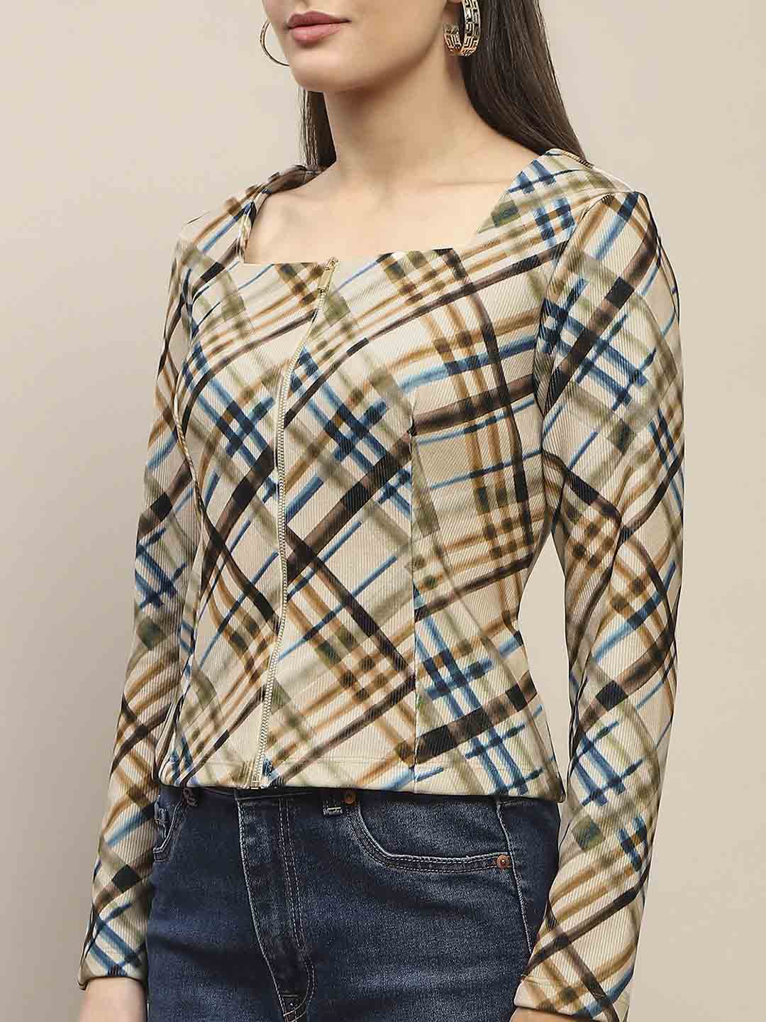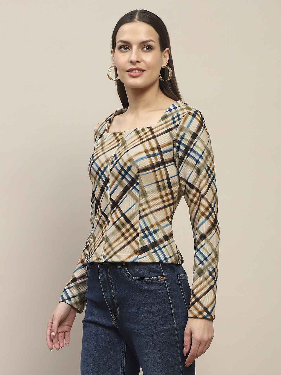 Madame Square Neck Front Zip All Over Print Corduroy Beige Top