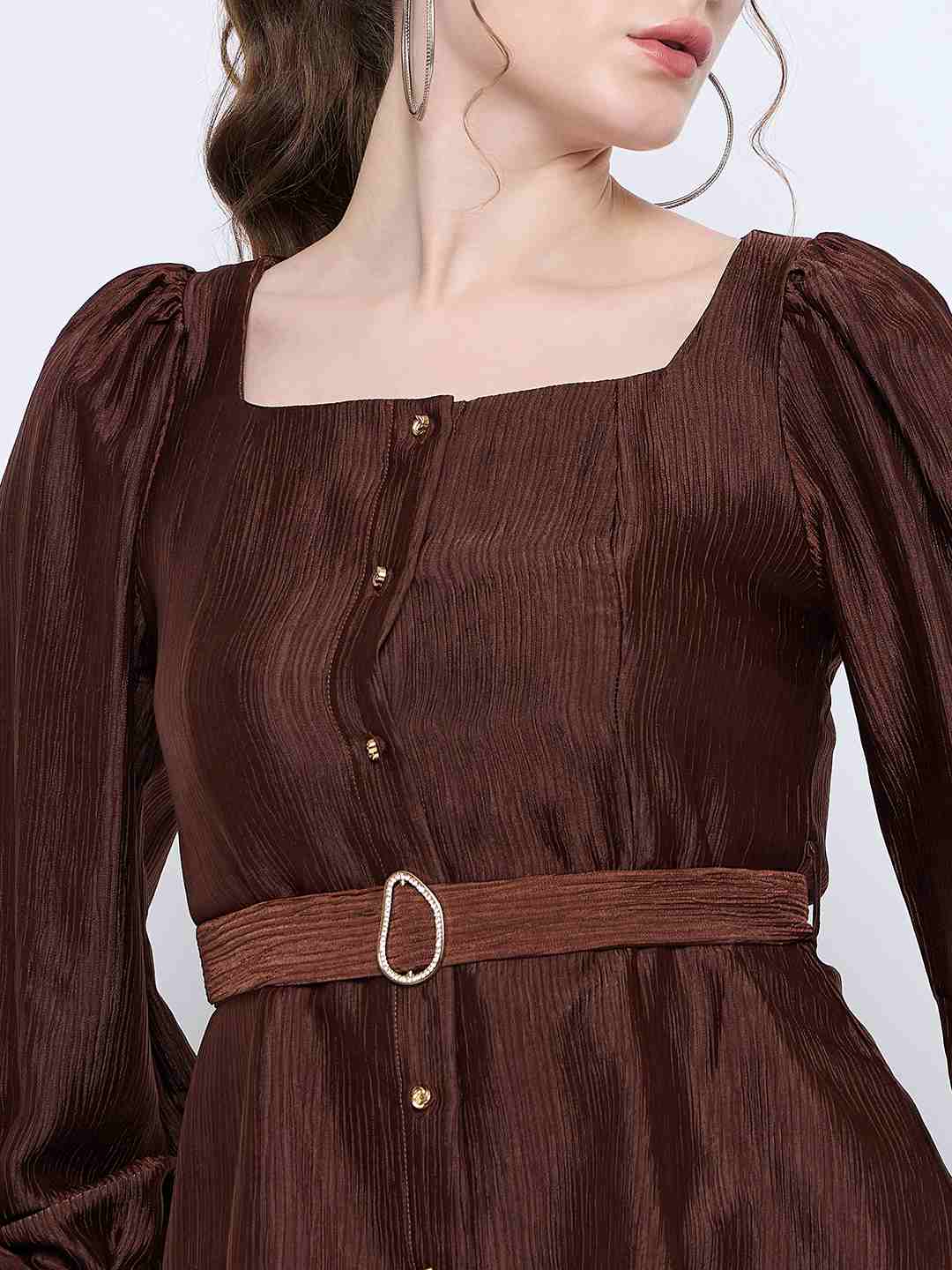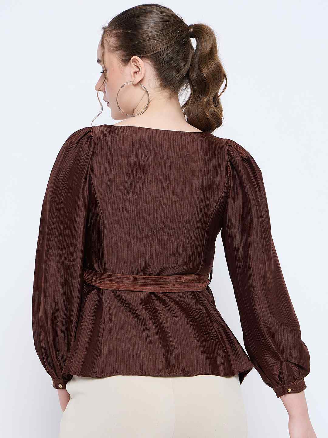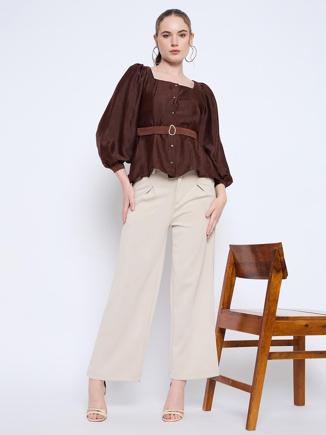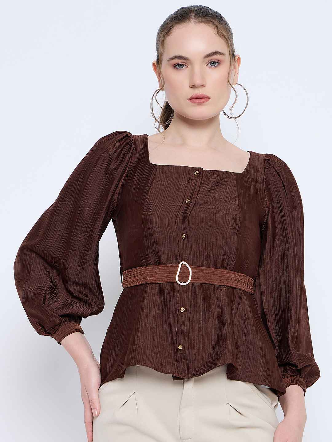 Madame Brown Rayon Blend Square Neck Belted Button Front Top