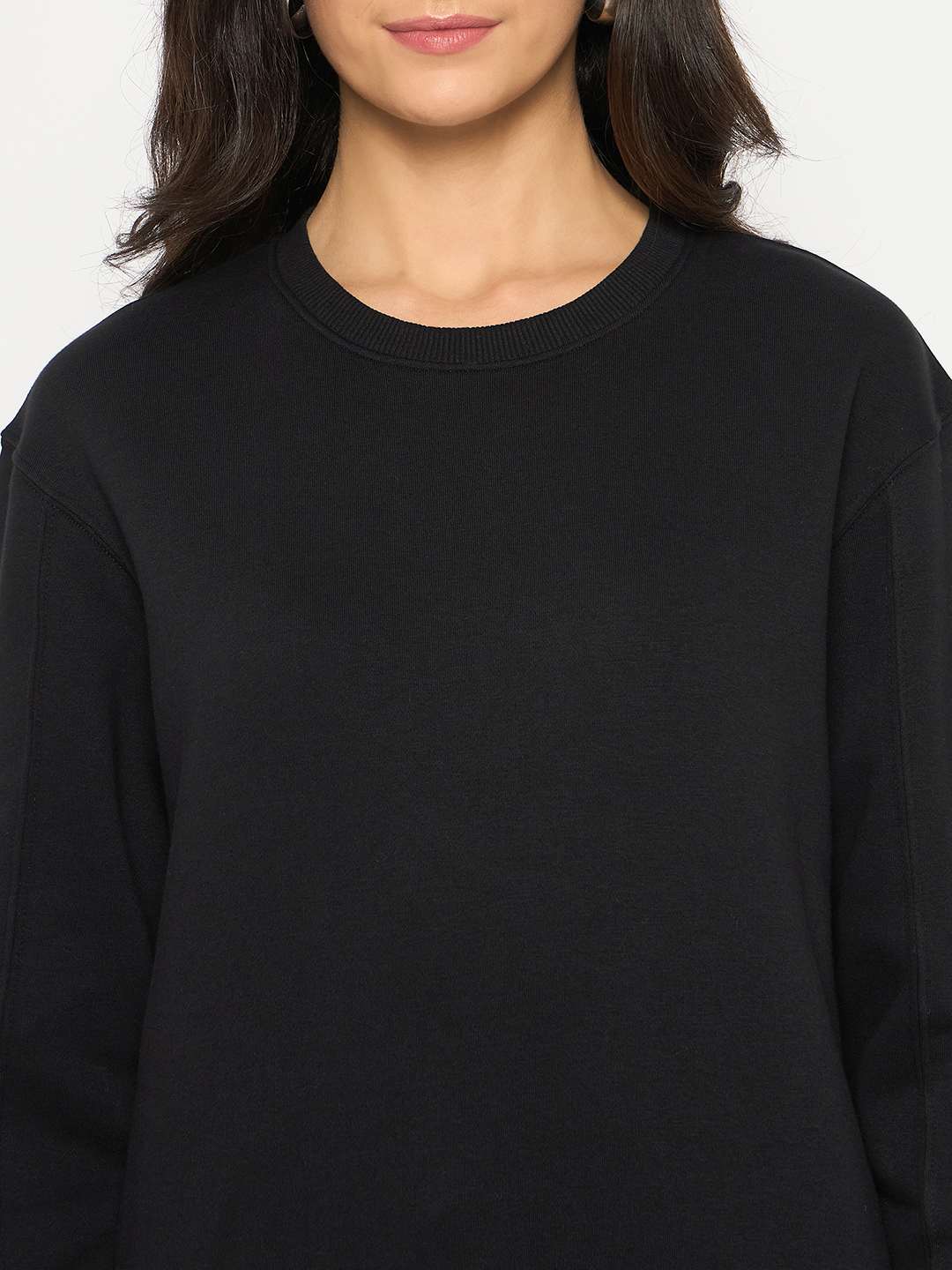 This sweatshirt offers a soft, cozy feel against your skin, making it ideal for those laid-back days or chilly evenings. The solid black color provides a versatile backdrop that pairs effortlessly with jeans, joggers, or even a skirt, allowing you to create a variety of looks. With its relaxed fit and classic crew neckline, this sweatshirt is designed for all-day wear, whether you're lounging at home, running errands, or meeting friends for coffee.