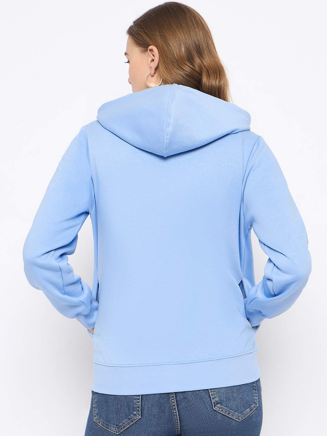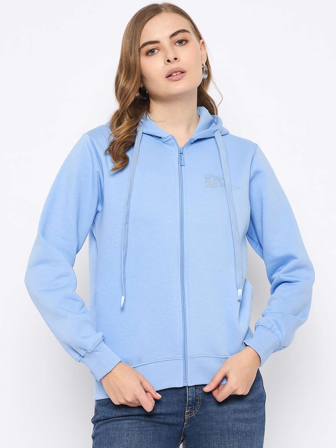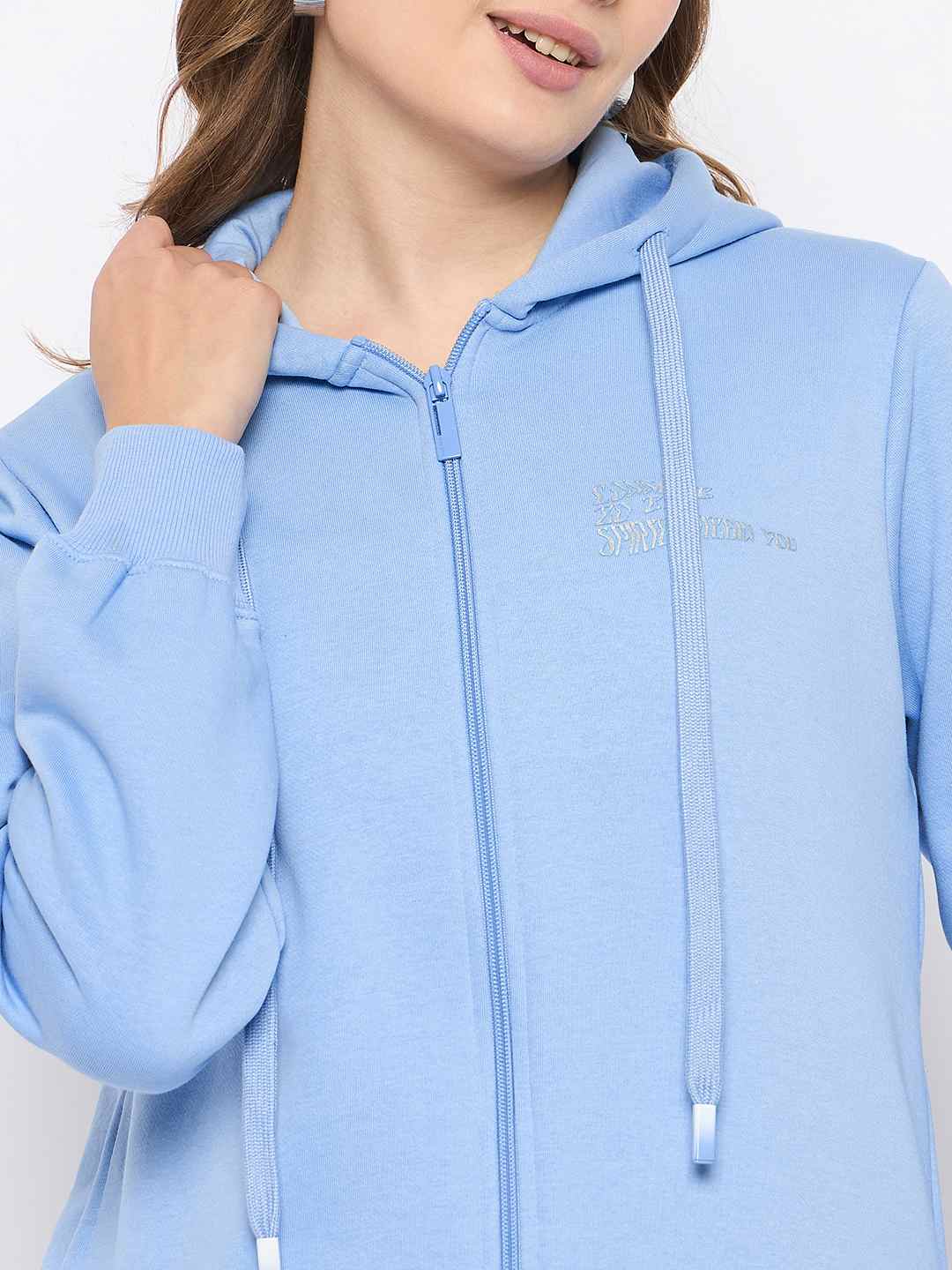 Madame Fleece Placement Printed Zipped Powder Blue Hooded Sweatshirt