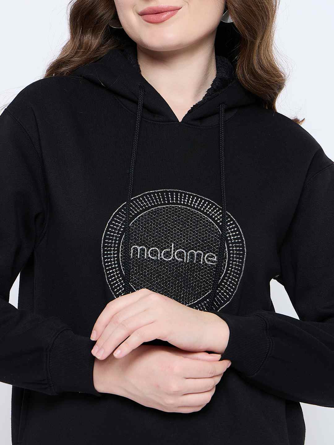 Madame Graphic Print Loose Fit Black Hooded Sweatshirt