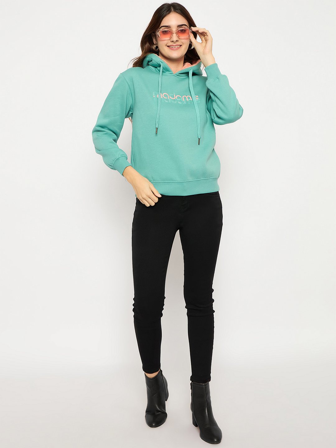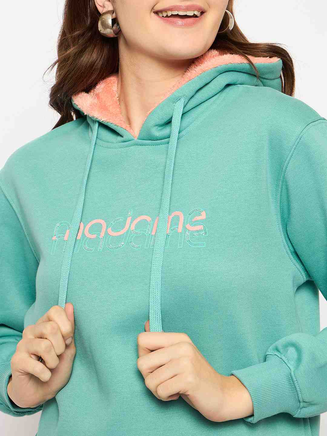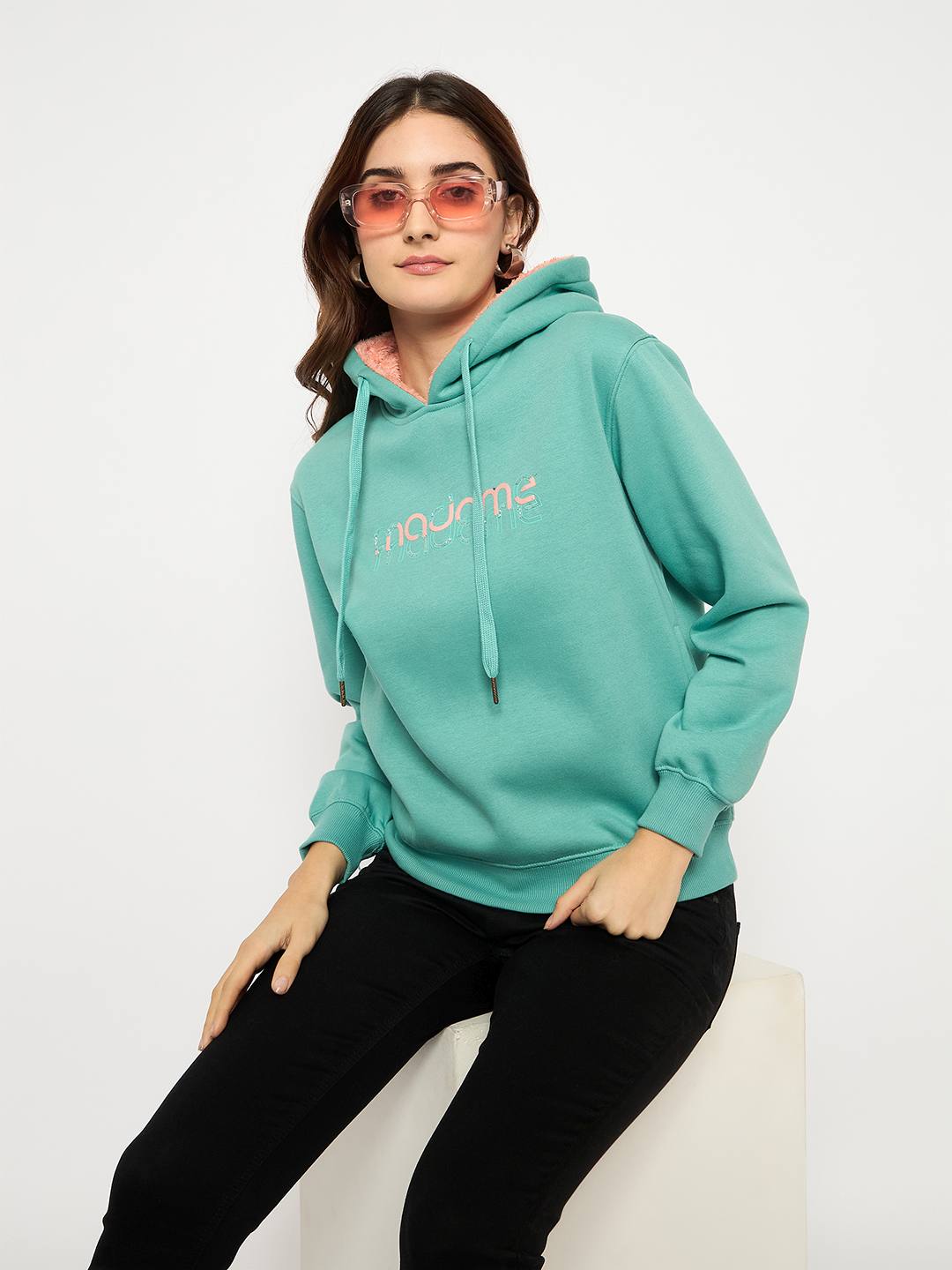 Featuring a unique seafoam green color, this sweatshirt is adorned with exclusive Madame branding print and intricate handwork details, adding a sophisticated touch to its cozy, oversized fit. Crafted from a soft cotton-blend fabric, it offers warmth and durability for everyday wear. The adjustable hood and front pocket make it practical, while the fashion-forward design ensures you stand out in style.