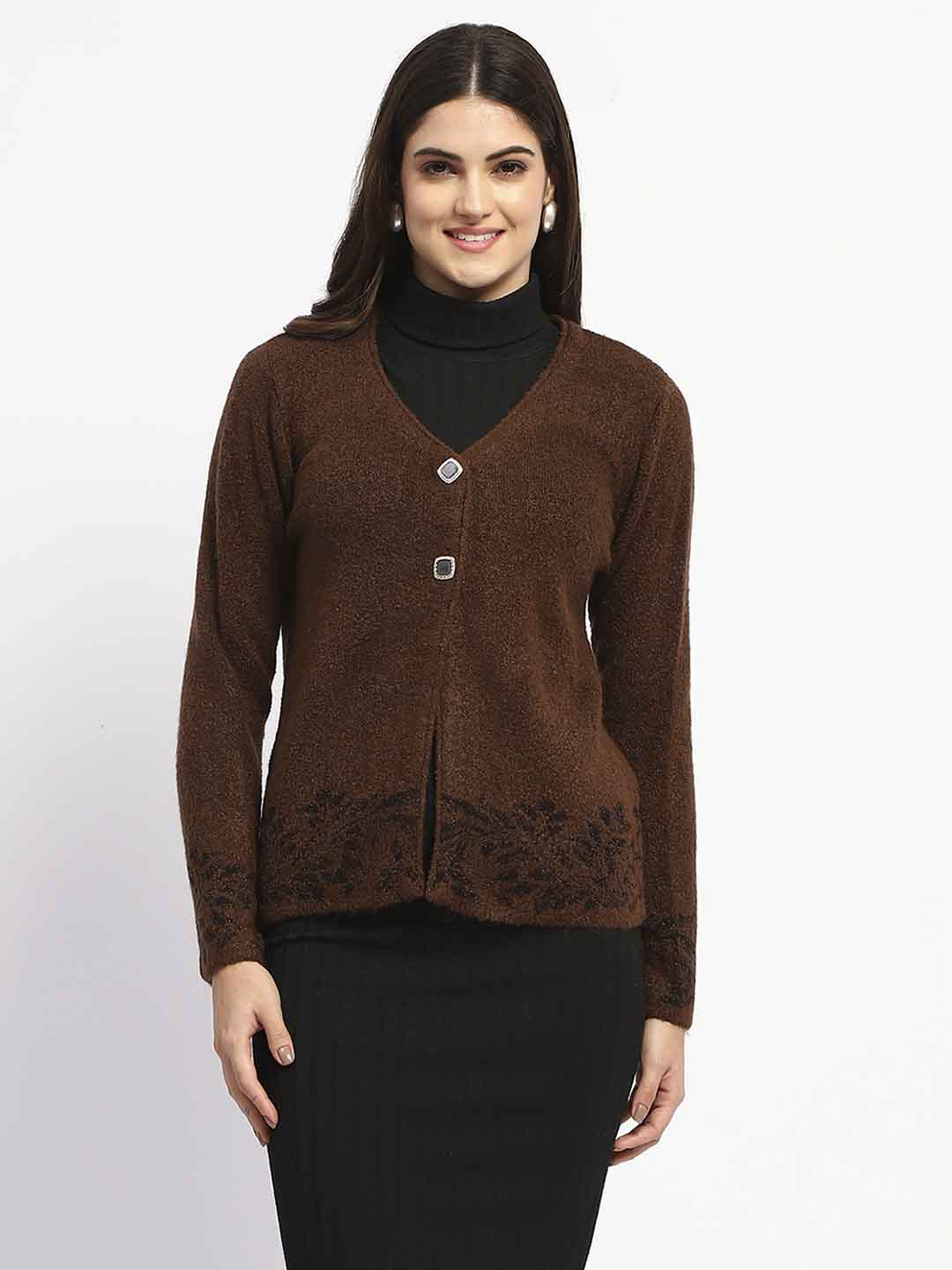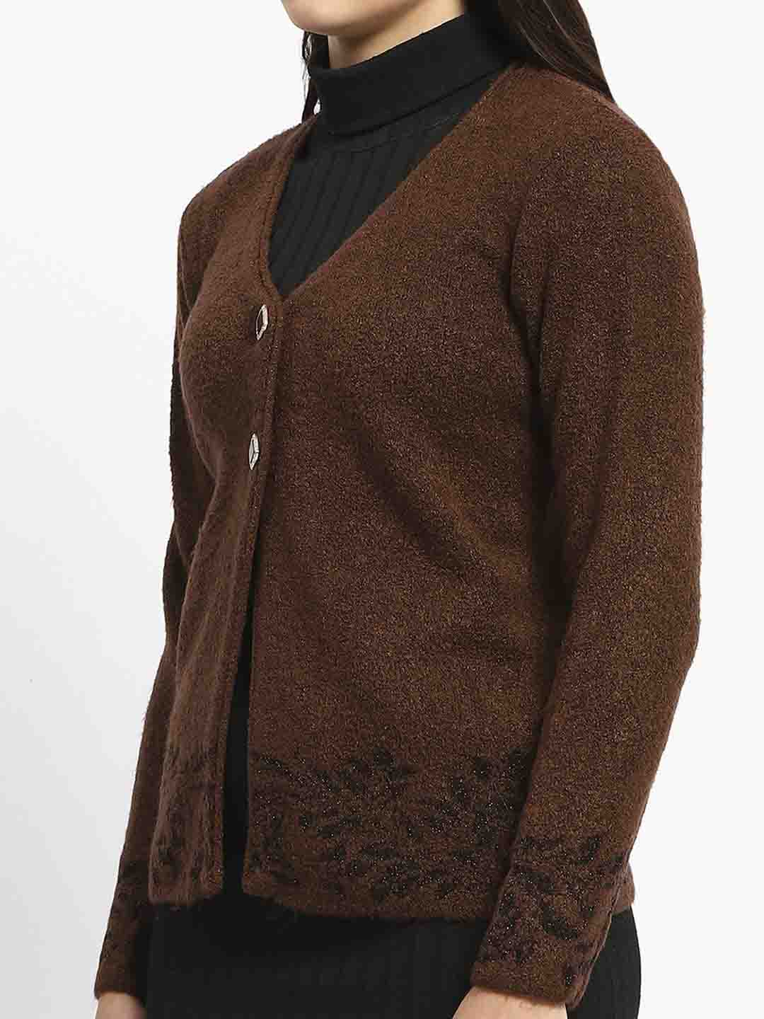 Madame Cable Knit Botanical Print Buttoned Brown Cardigan