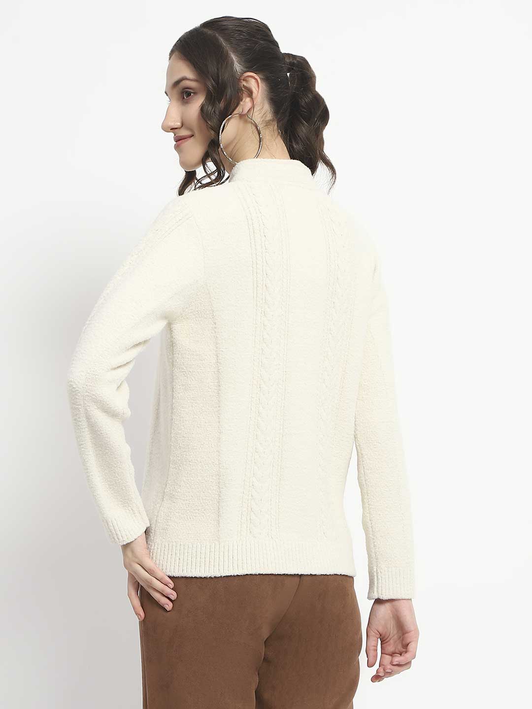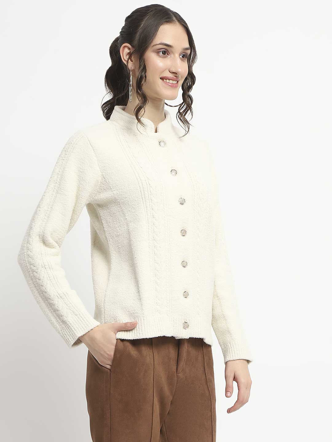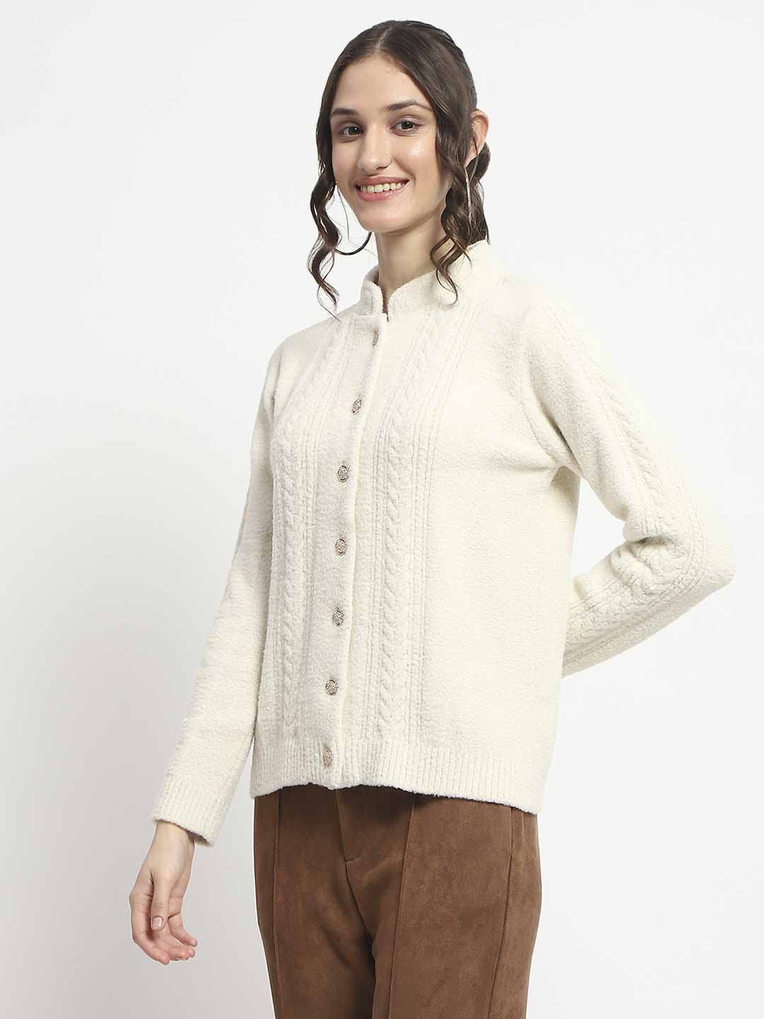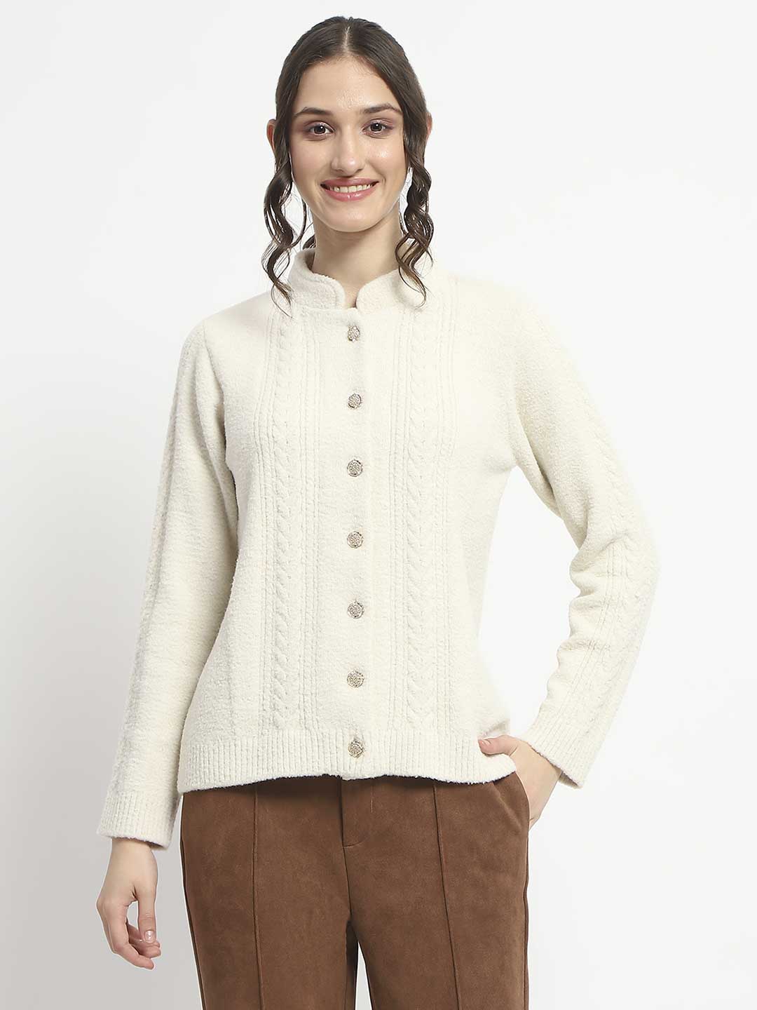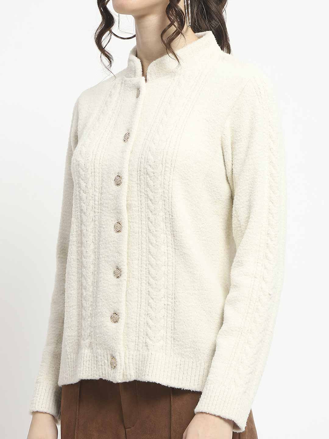 Madame Button Down Cable Knit Solid Beige Cardigan