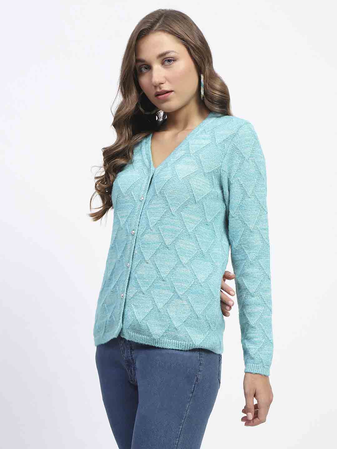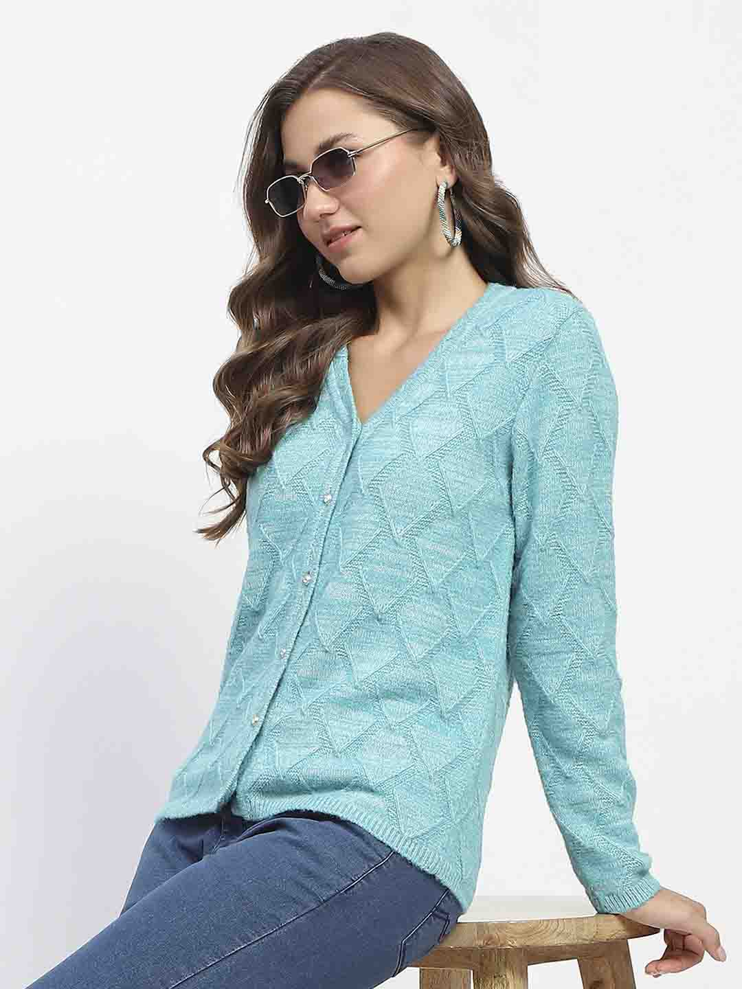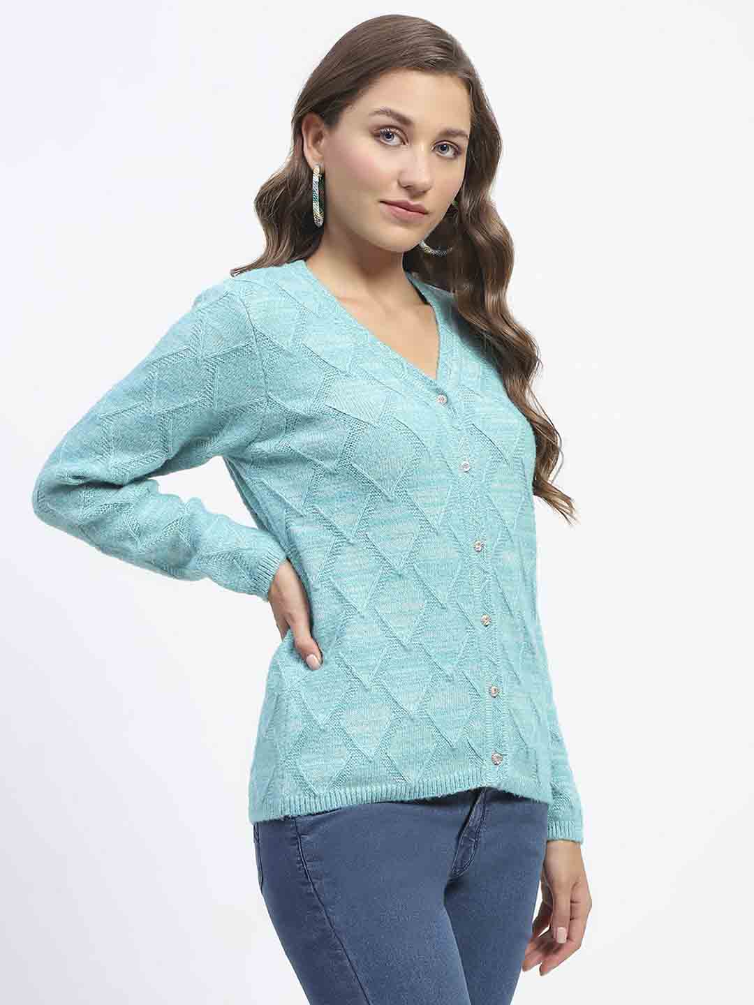 Make a stunning entrance with this charismatic sky cardigan. This cardigan features intricate detailing along the V neckline for a touch of elegance. The soft sky blue color adds a pop of color to any outfit, making it a versatile piece for both casual and formal occasions. Pair it with jeans for a chic daytime look or layer it over a dress for a sophisticated evening ensemble. Stay stylish and cozy with our sky cardigan, a must-have addition to your closet.