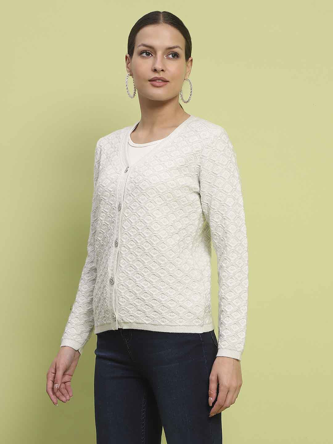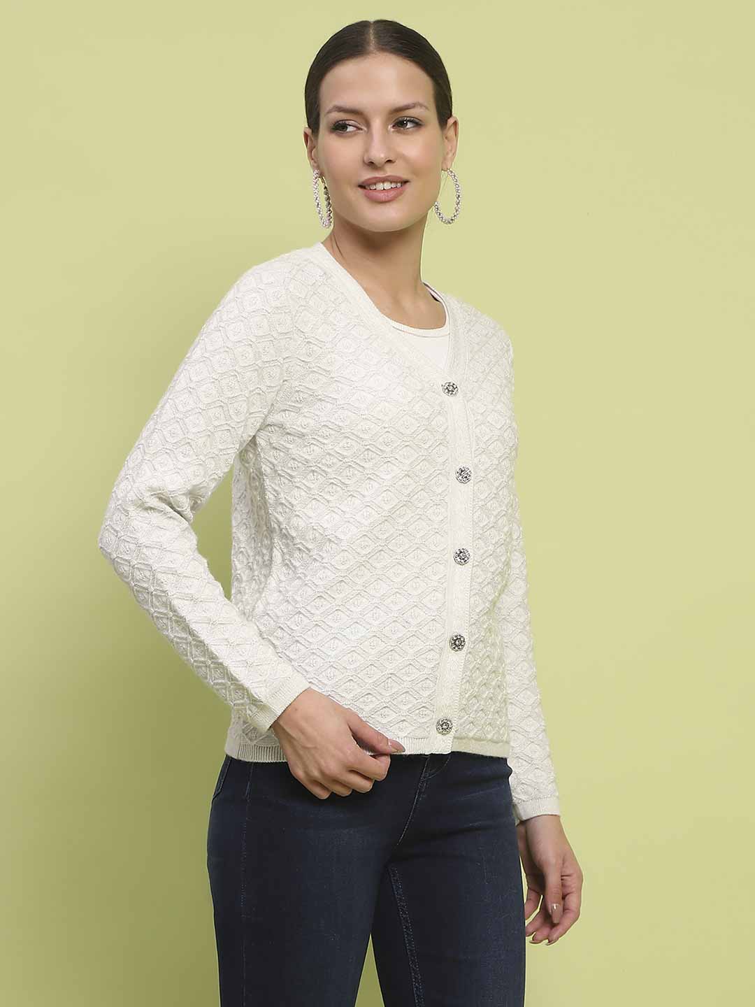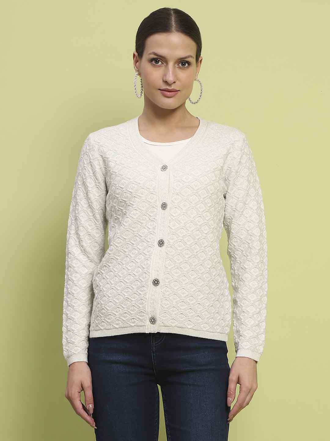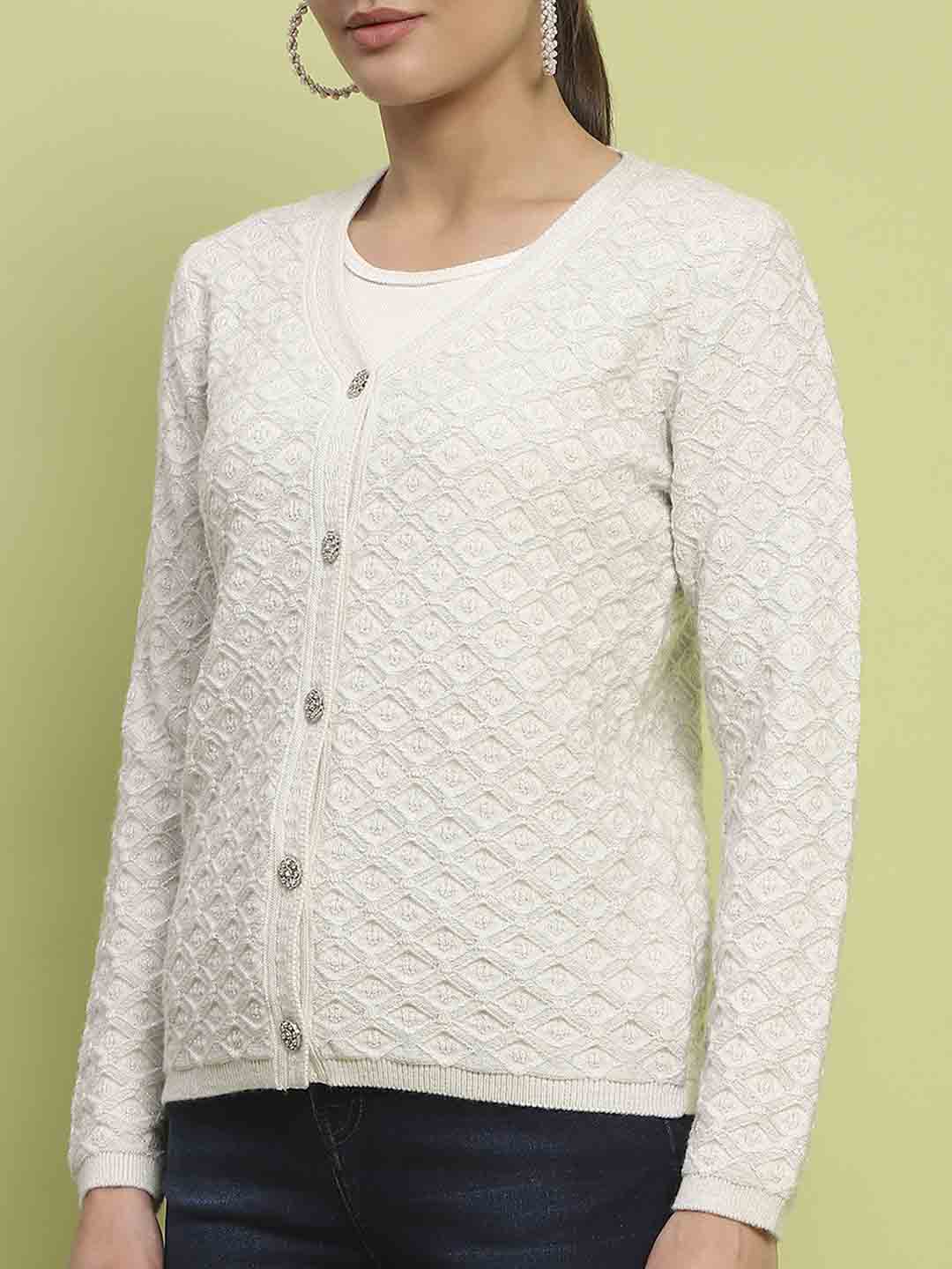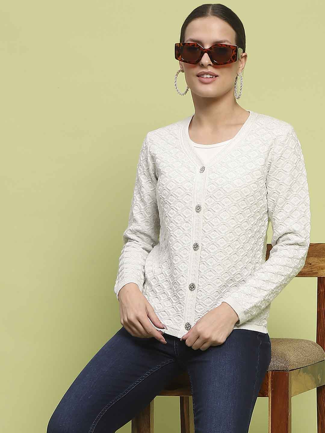 Don't chase but embrace the cozy vibes with this stylish piece which is crafted from a soft acrylic blend. The off-white color is versatile, making it easy to pair with just about anything in your wardrobe. The intricate cable knit design adds a touch of texture and sophistication, elevating your outfit instantly. With its relaxed fit and cozy feel, this cardigan is perfect for layering over your favorite tees or dresses. Whether you're heading to brunch with friends or curling up with a good book, this cardigan is sure to become a staple in your closet.