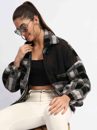 Madame Knitted Self-Textured Zipped Black Hooded Sweatshirt
