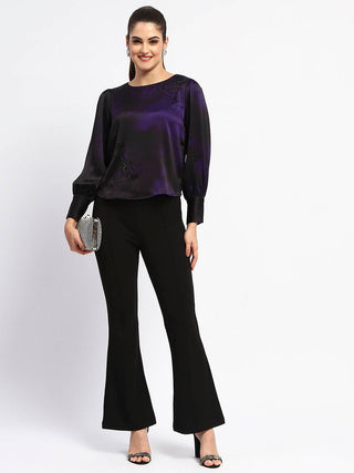 Madame Solid Plum Ruffle Sleeve Satin Top