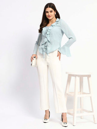 Madame Solid Sky Blue Ruffle Neck Bell Sleeve Top