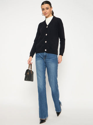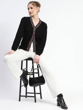 Madame Colorful Embroidered Trim V-Neck Black Cardigan