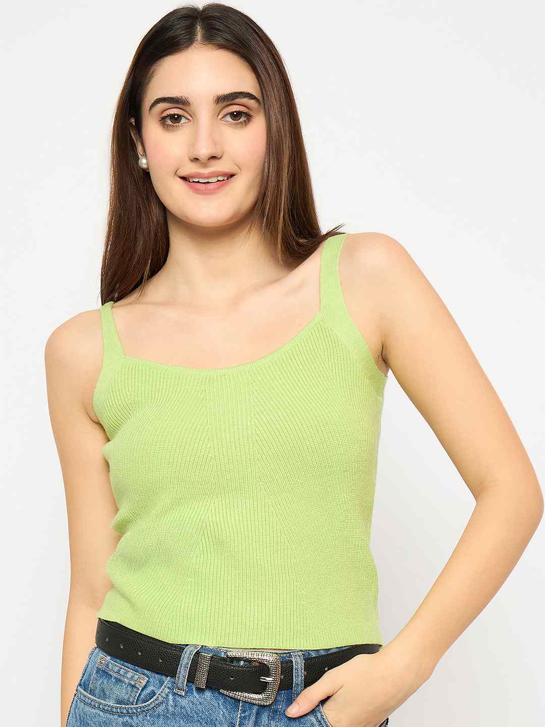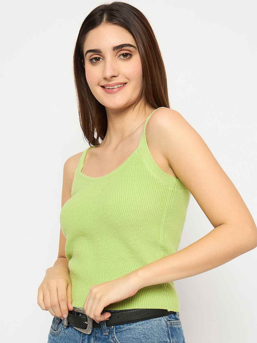 Madame Sleeveless Solid Green Ribbed Knit Sweater