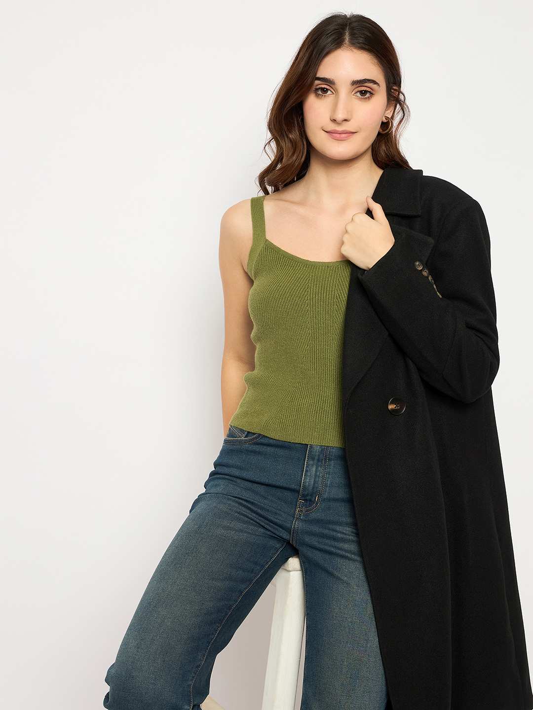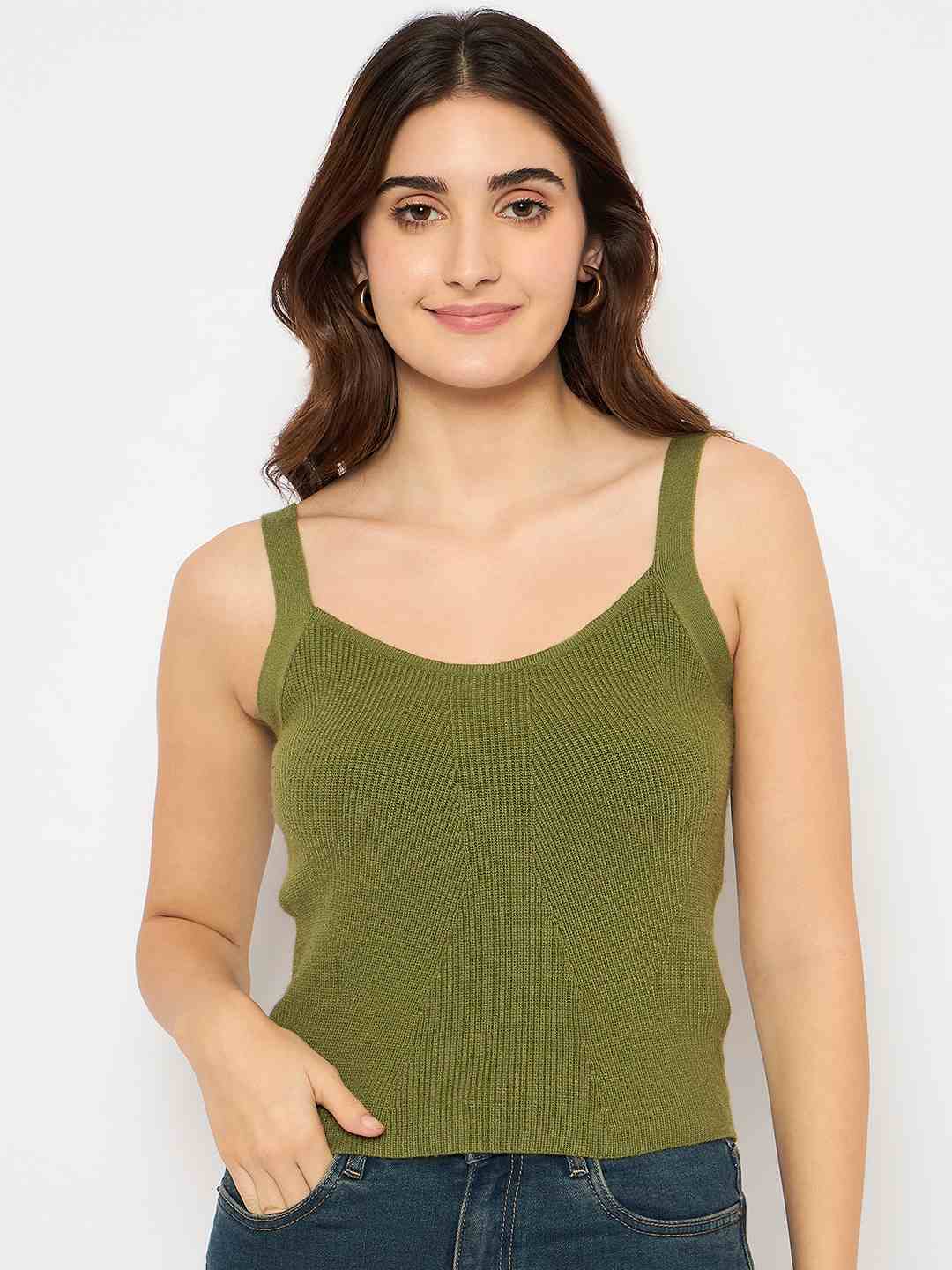 Madame Sleeveless Solid Olive Green Ribbed Knit Sweater