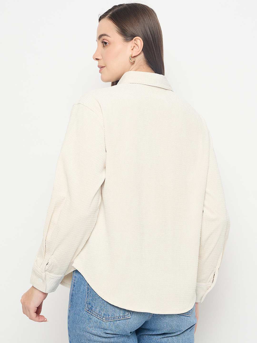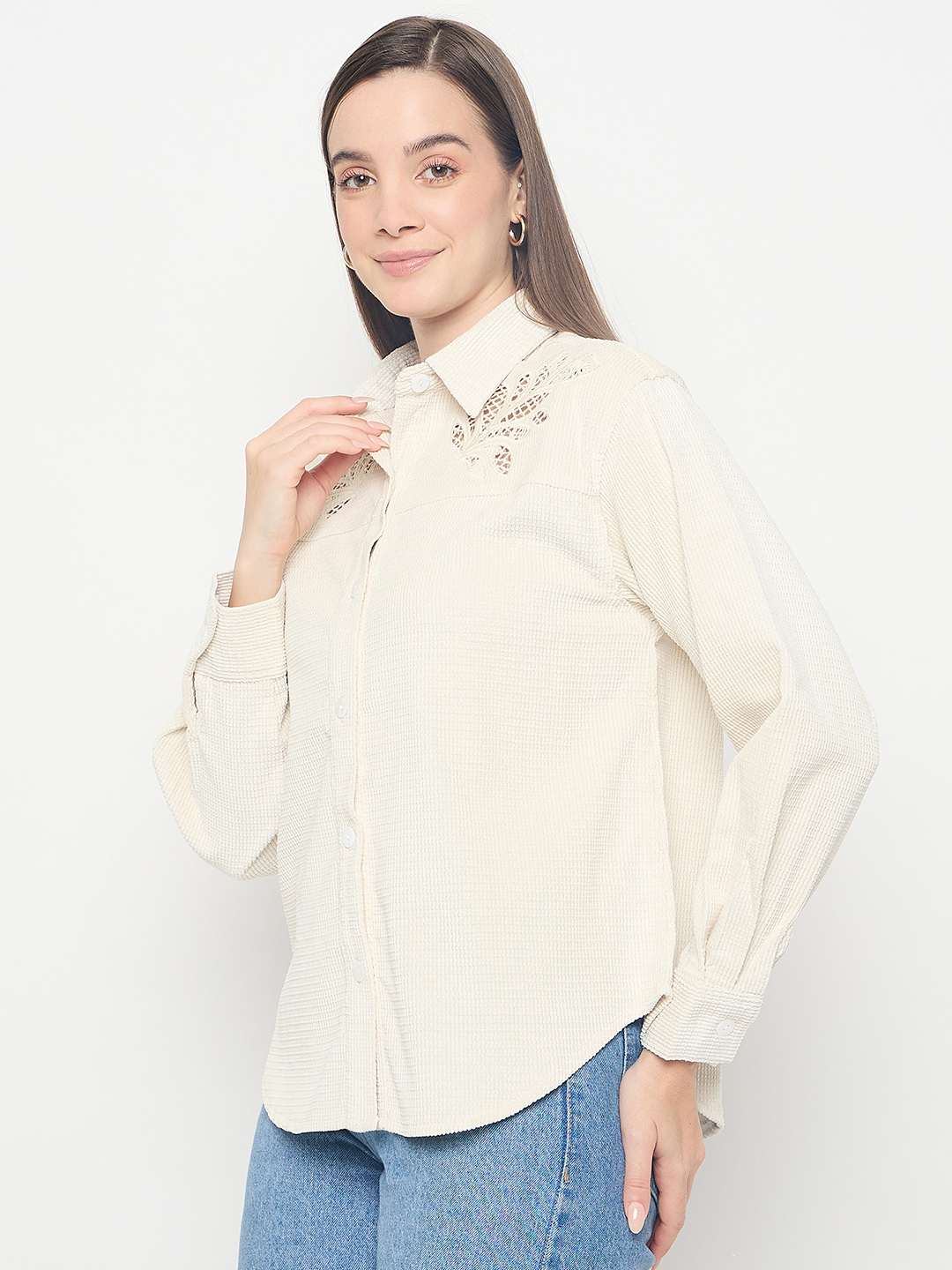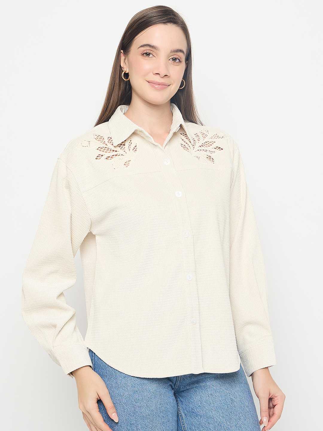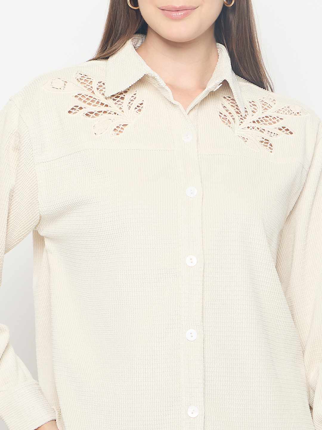Delicate cutwork meets crisp sophistication in this off-white stunner flaunts intricate cutwork. Designed for those who love drama, it blends charm with flair.