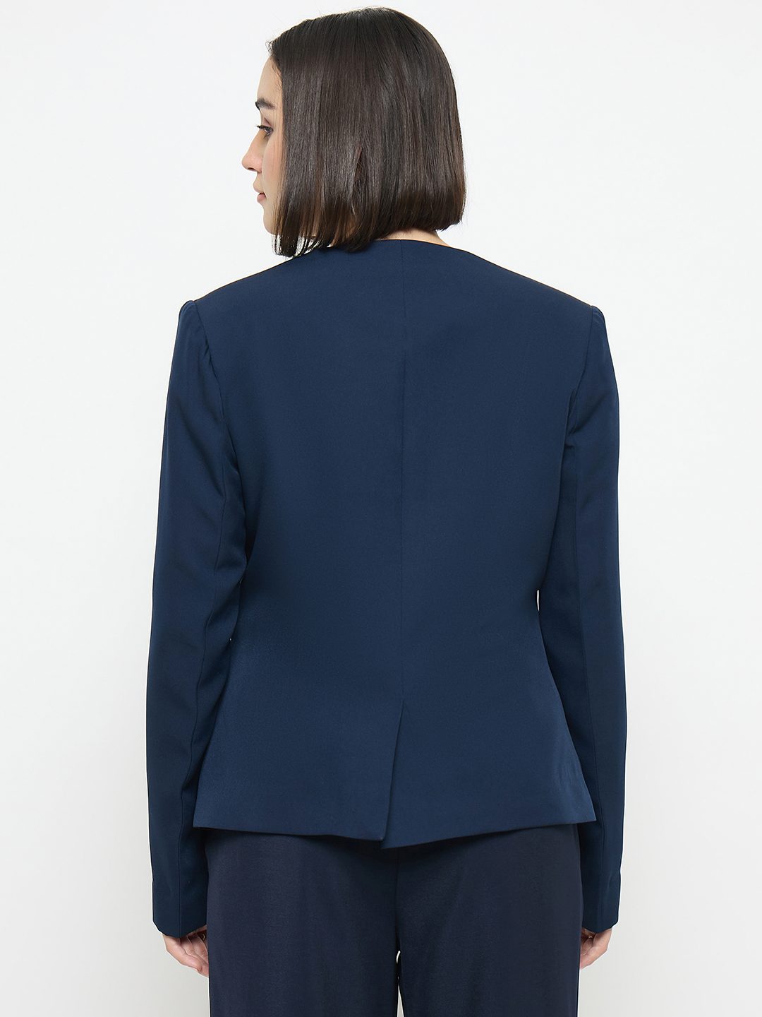 Madame blue round neck blazer combines elegance with modern simplicity. Its clean lines and tailored fit make it perfect for office wear or casual chic styling, adding a polished touch to any outfit effortlessly.