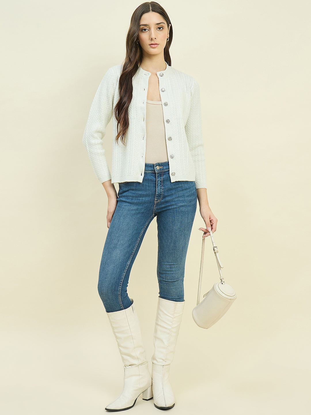 Madame Off White Round Neck Cardigan with Buttons adds a touch of elegance to any outfit. Soft and lightweight, its buttoned design makes it perfect for layering over dresses or tops for a polished, casual-chic look.