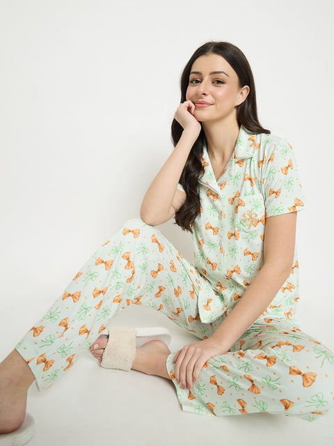 mSECRET Graphic Print Top and Straight Bottom Mint Green Nightsuit