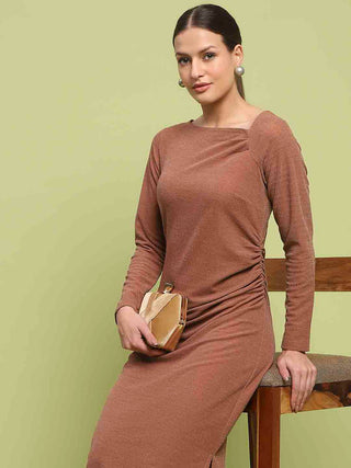 Madame Front Ruched Self Design Rust Red Knit Maxi Dress