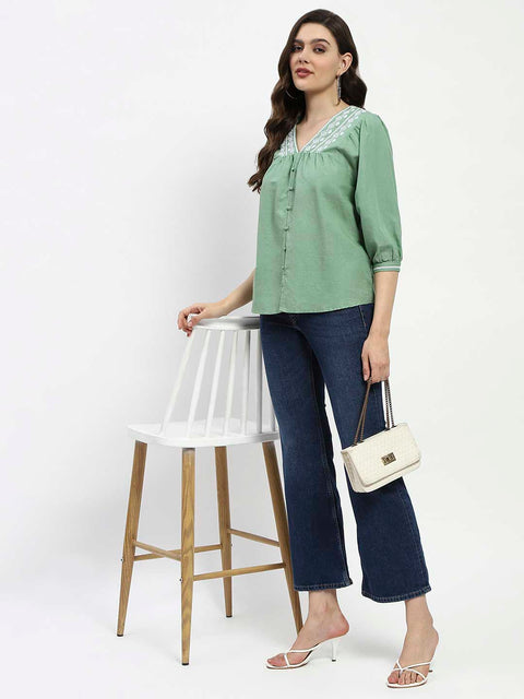 Madame Embroidered Cotton Blend Green Tunic Top
