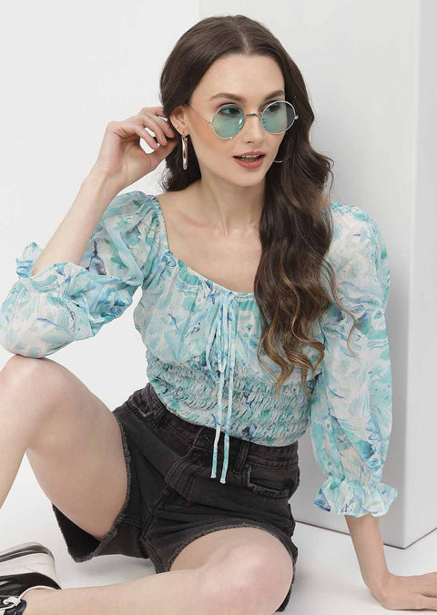 Madame Poet Sleeve Mint Blue Smocked Crop Top