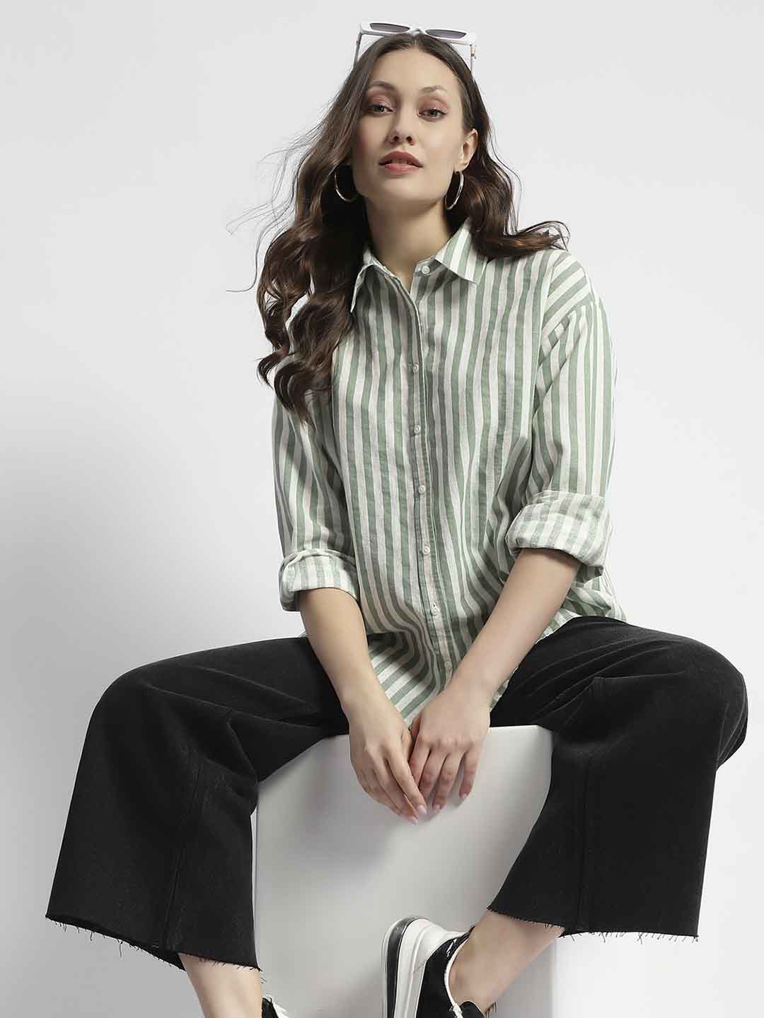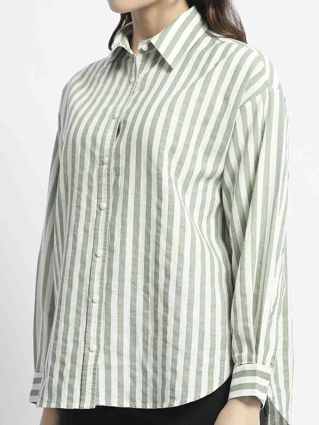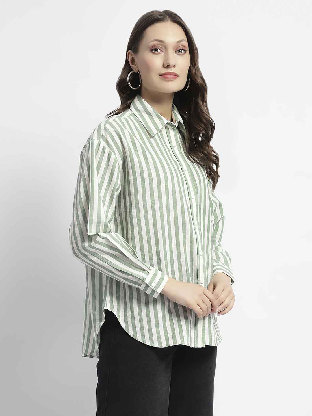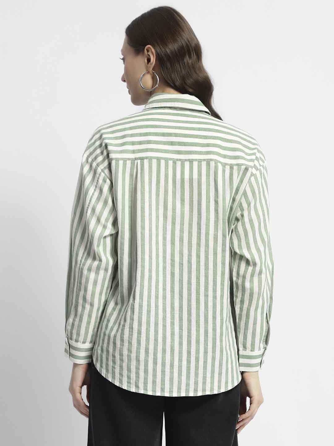 Madame Dusty Green And White Striped Regular Shirt