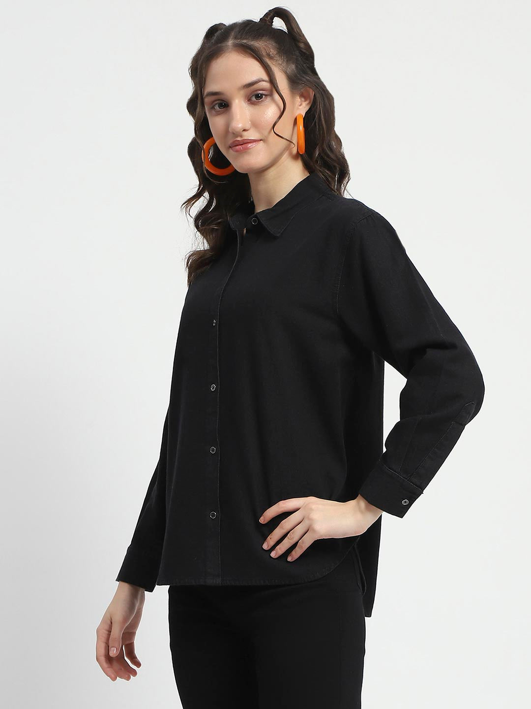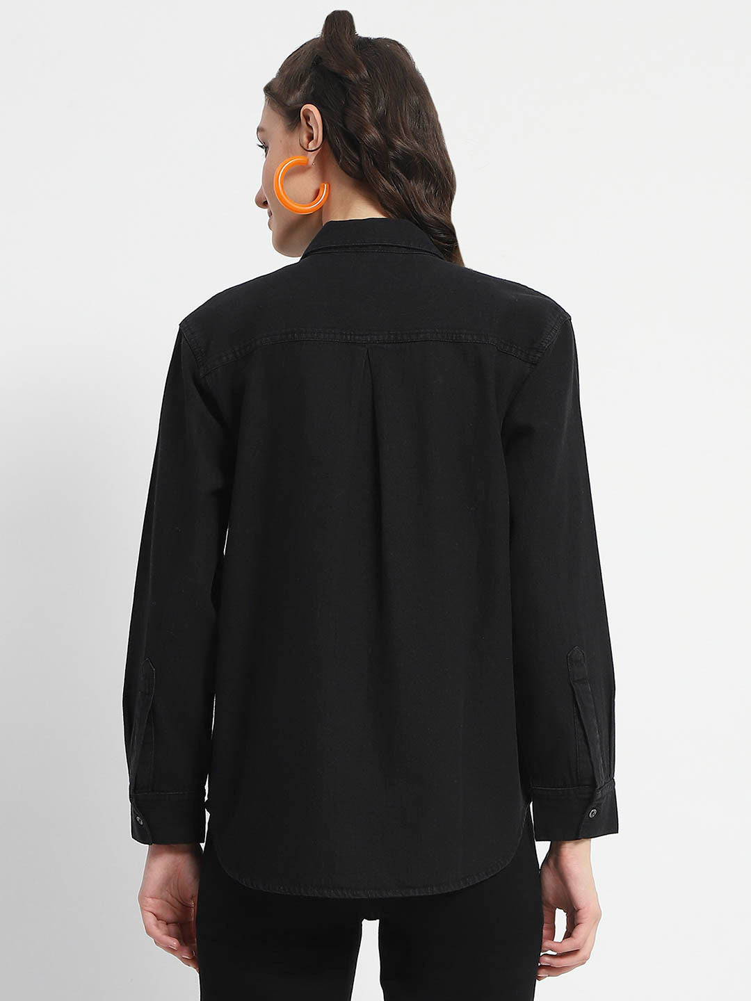 Madame Grey Wash Solid Black Button Down Denim Shirt