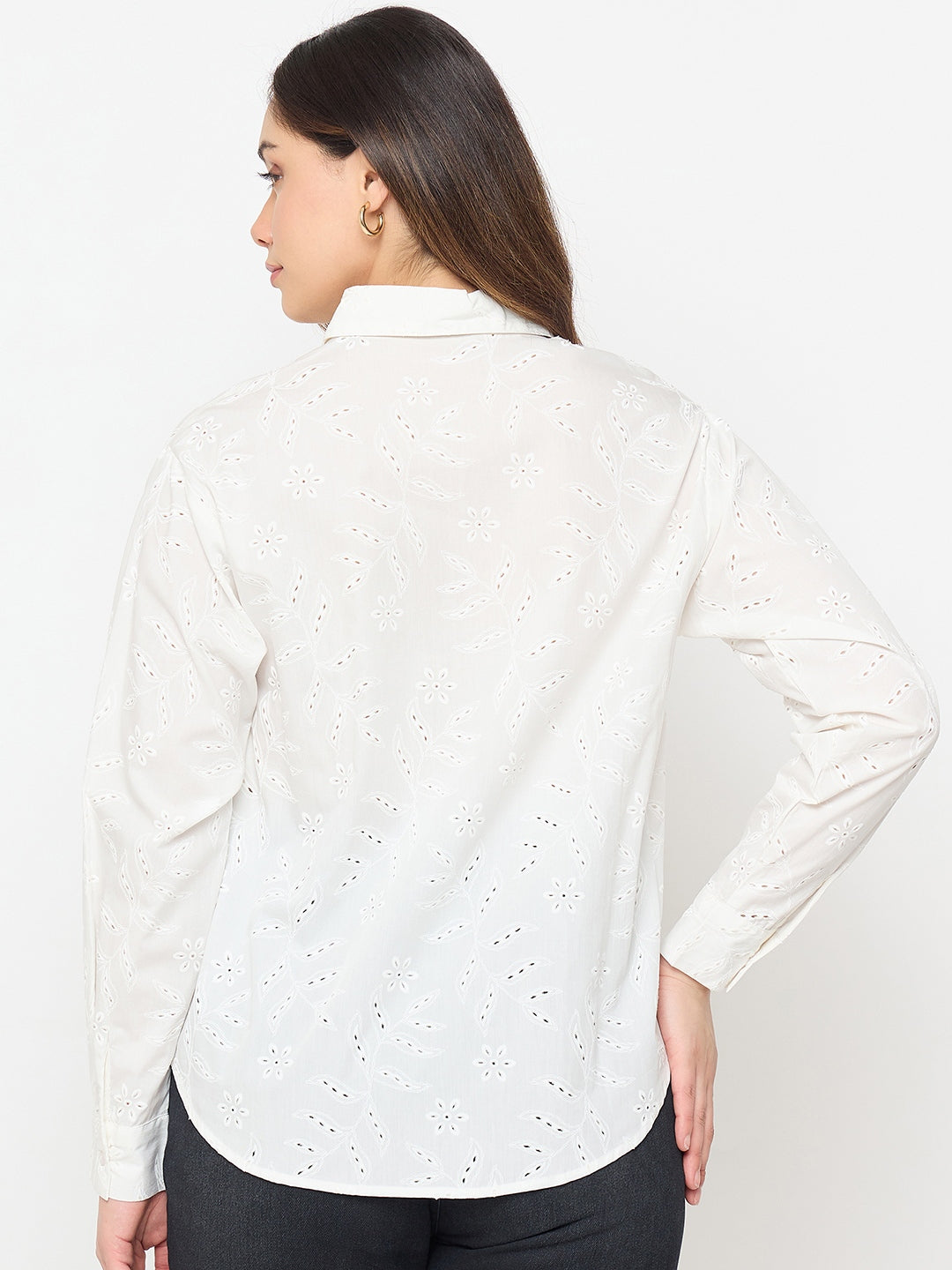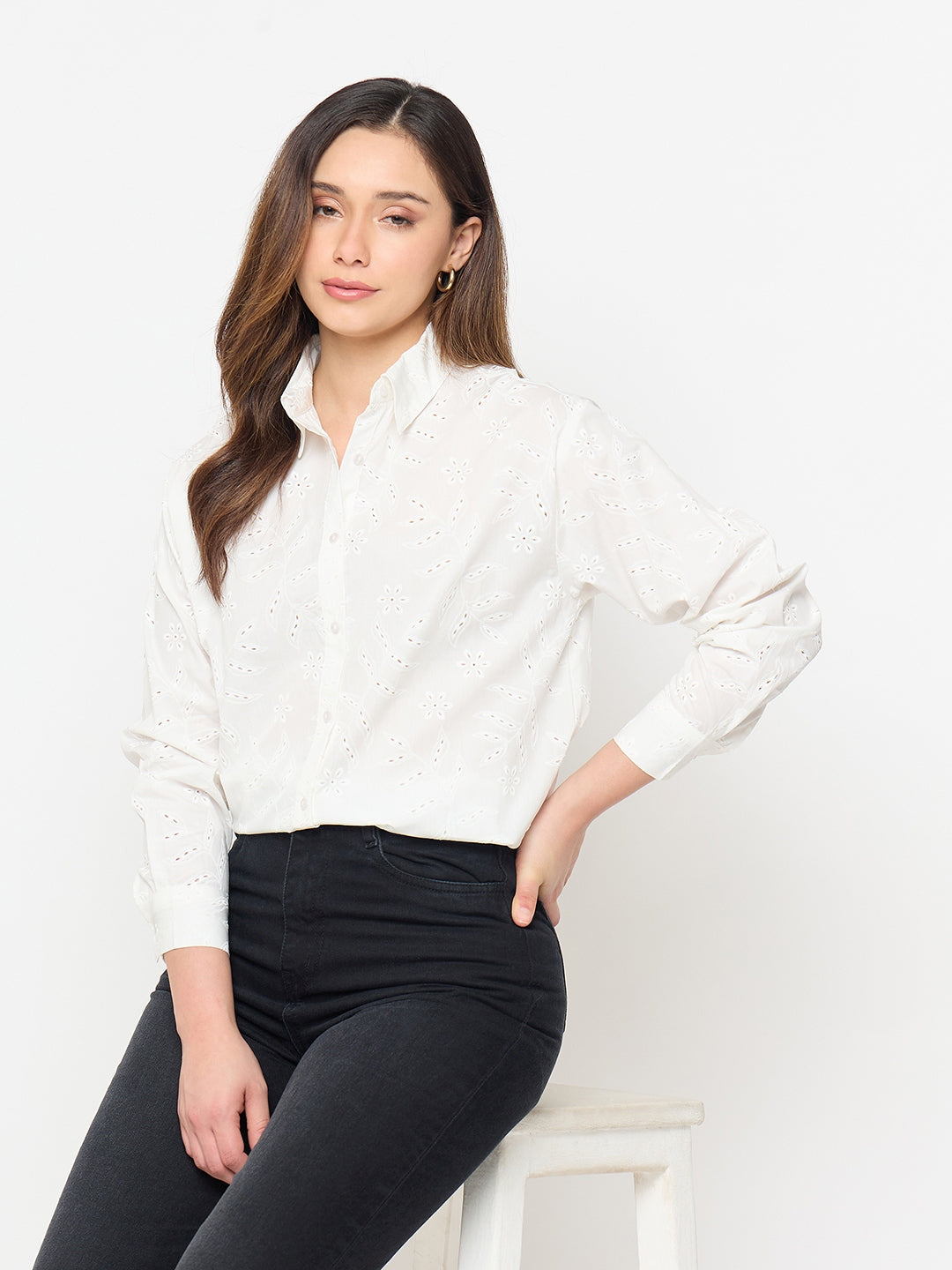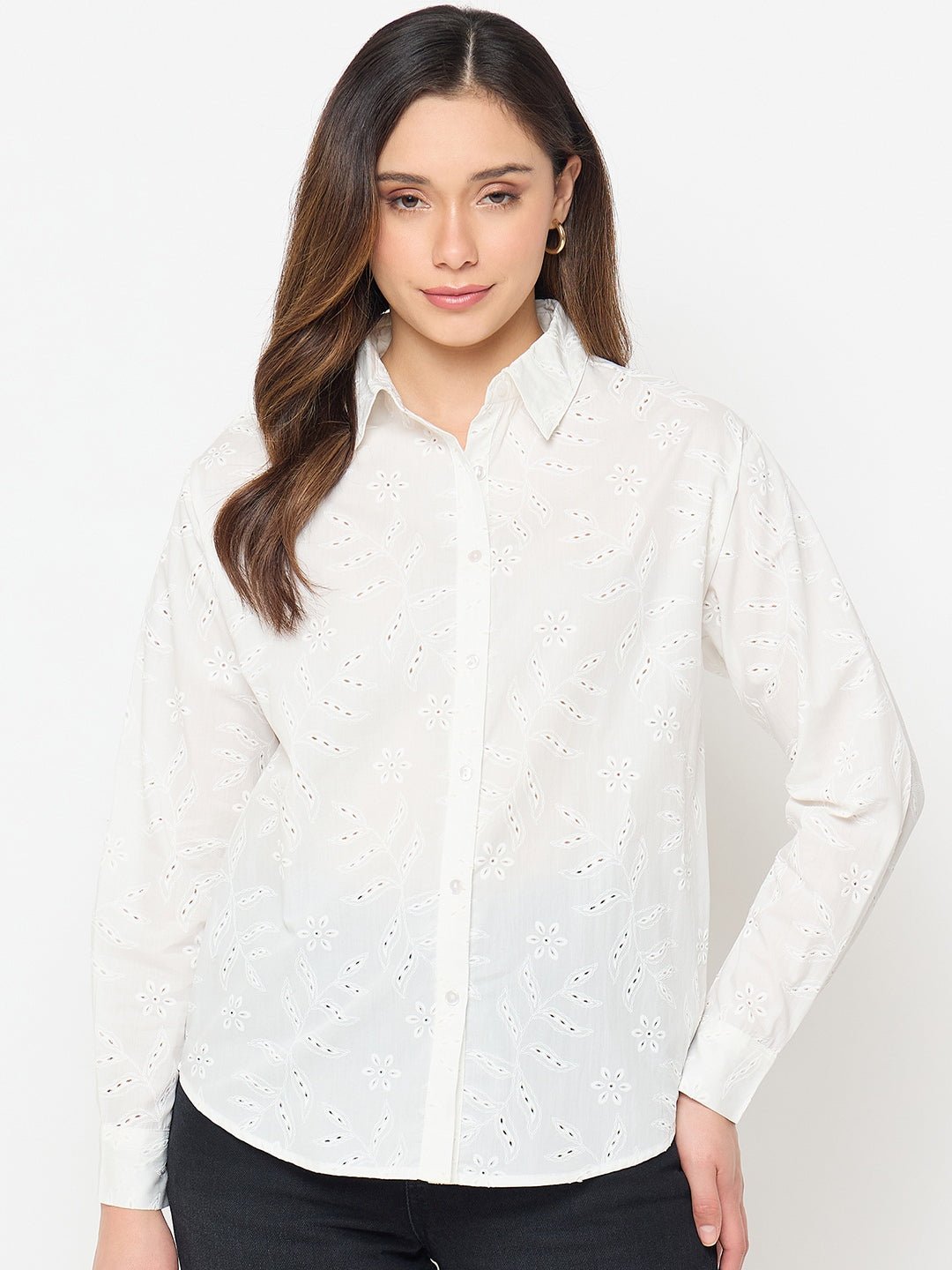 A fresh take on everyday style, this white cotton shirt comes with subtle prints and a classic button-down front. Its breathable fabric and easy silhouette make it a go-to for relaxed yet refined looks.