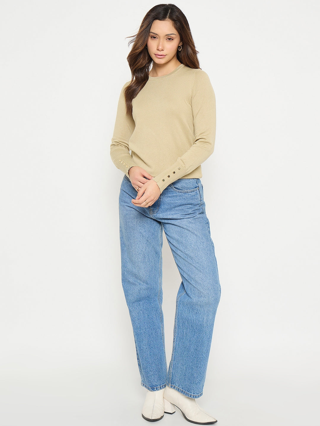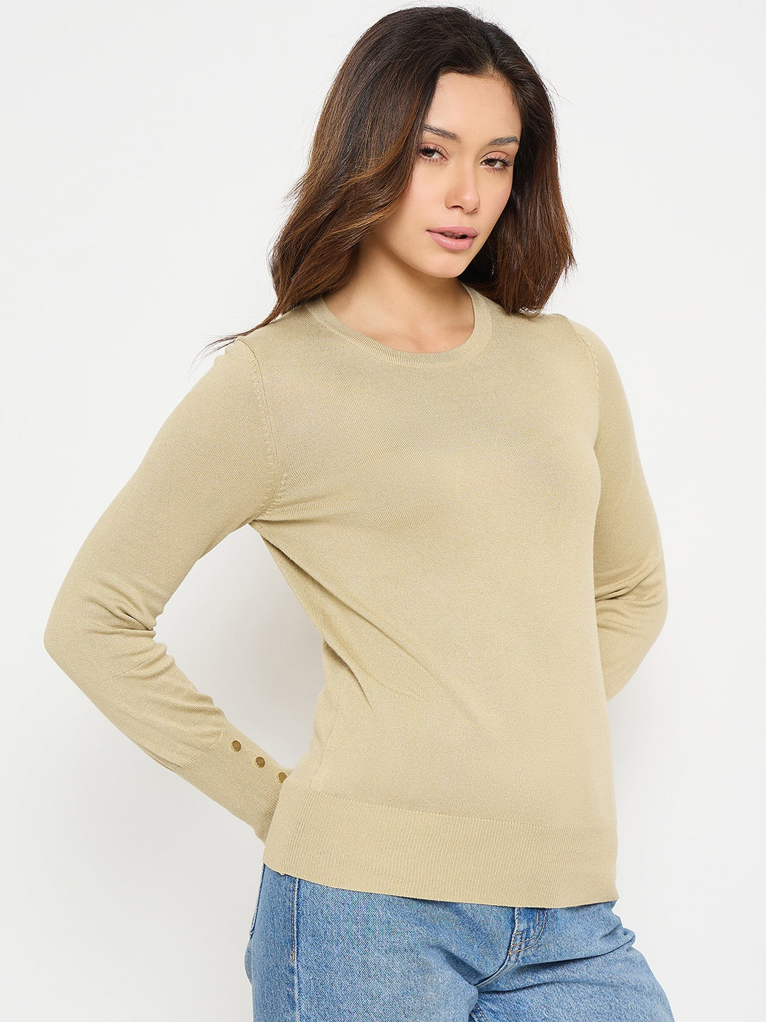 Madame Beige Solid Sweater with Cuff Sleeves