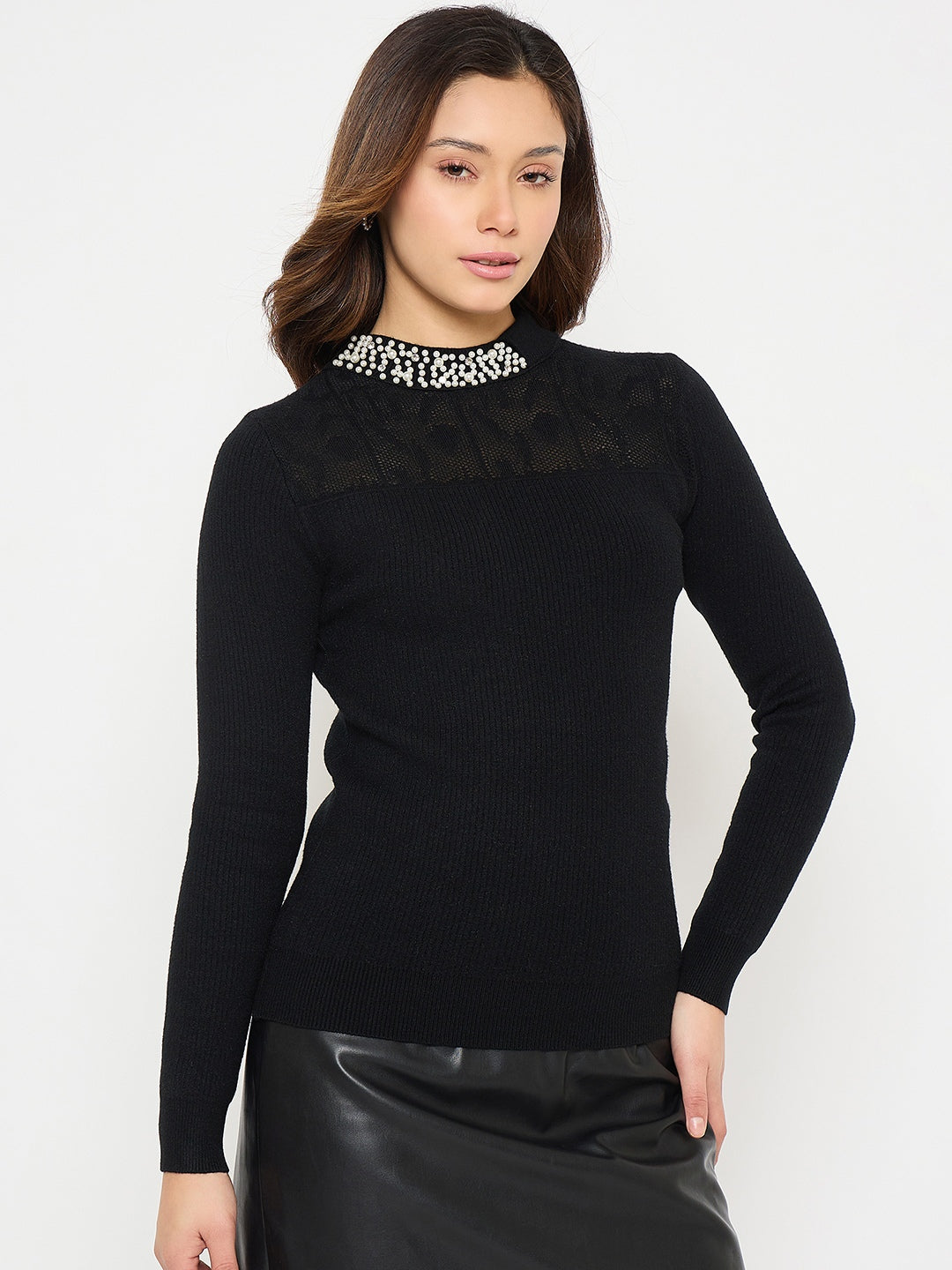 Add a touch of elegance to your wardrobe with this black mock neck sweater from Madame. Featuring intricate embellishments and a classic mock neckline, it combines cozy comfort with refined style. Crafted from soft, warm fabric, this versatile sweater is perfect for dressing up or layering for polished everyday and evening looks.