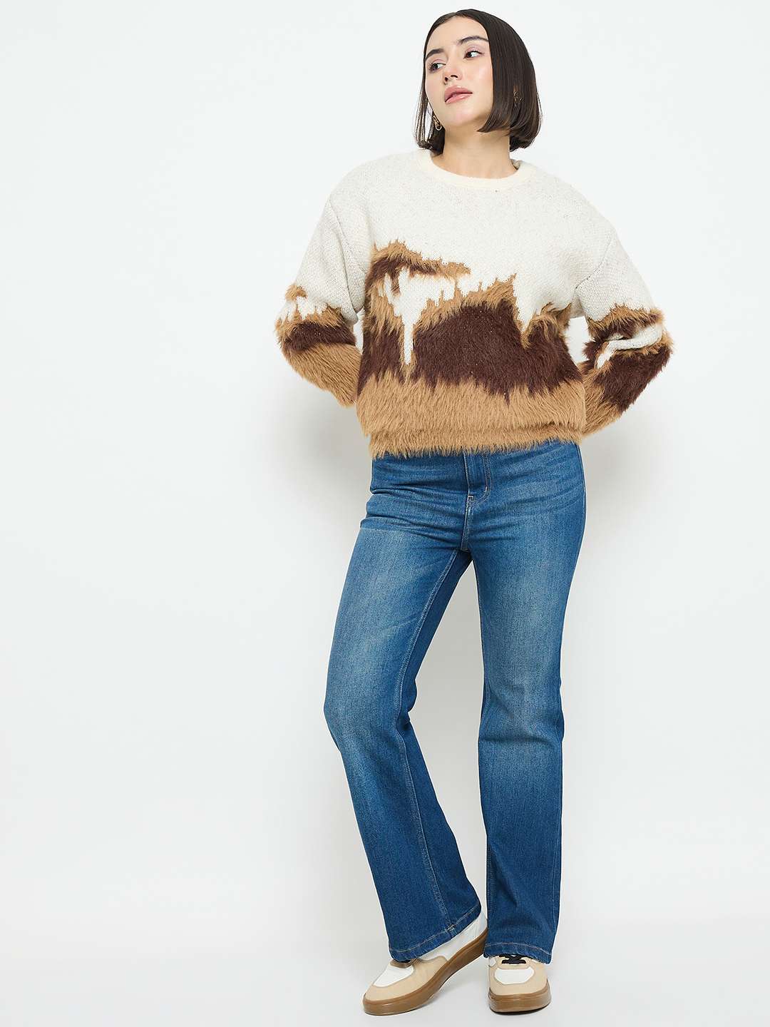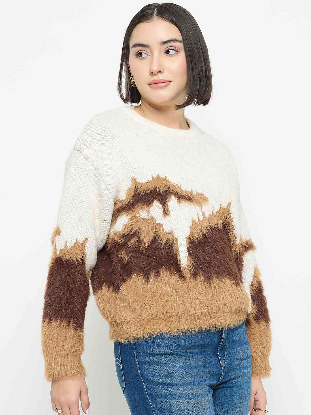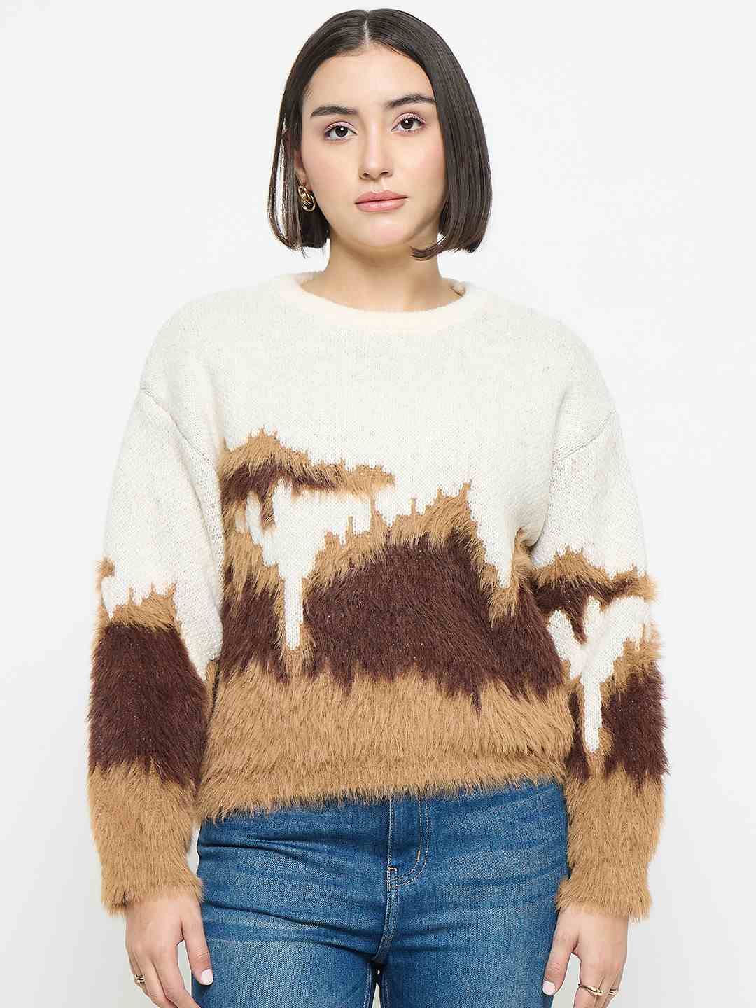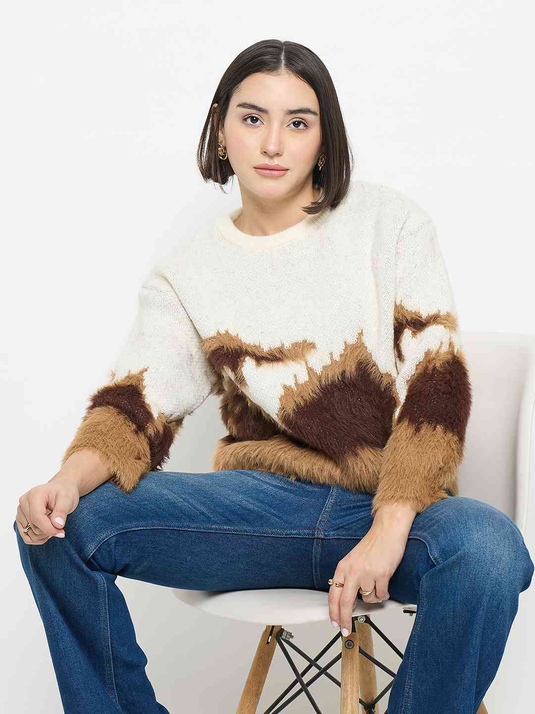 The Madame Abstract Pattern Camel Brown Sweater features soft knit fabric, abstract pattern detailing, and a relaxed fit in camel brown. Comfortable, versatile, and ideal for casual outings, everyday wear, and layered styling.