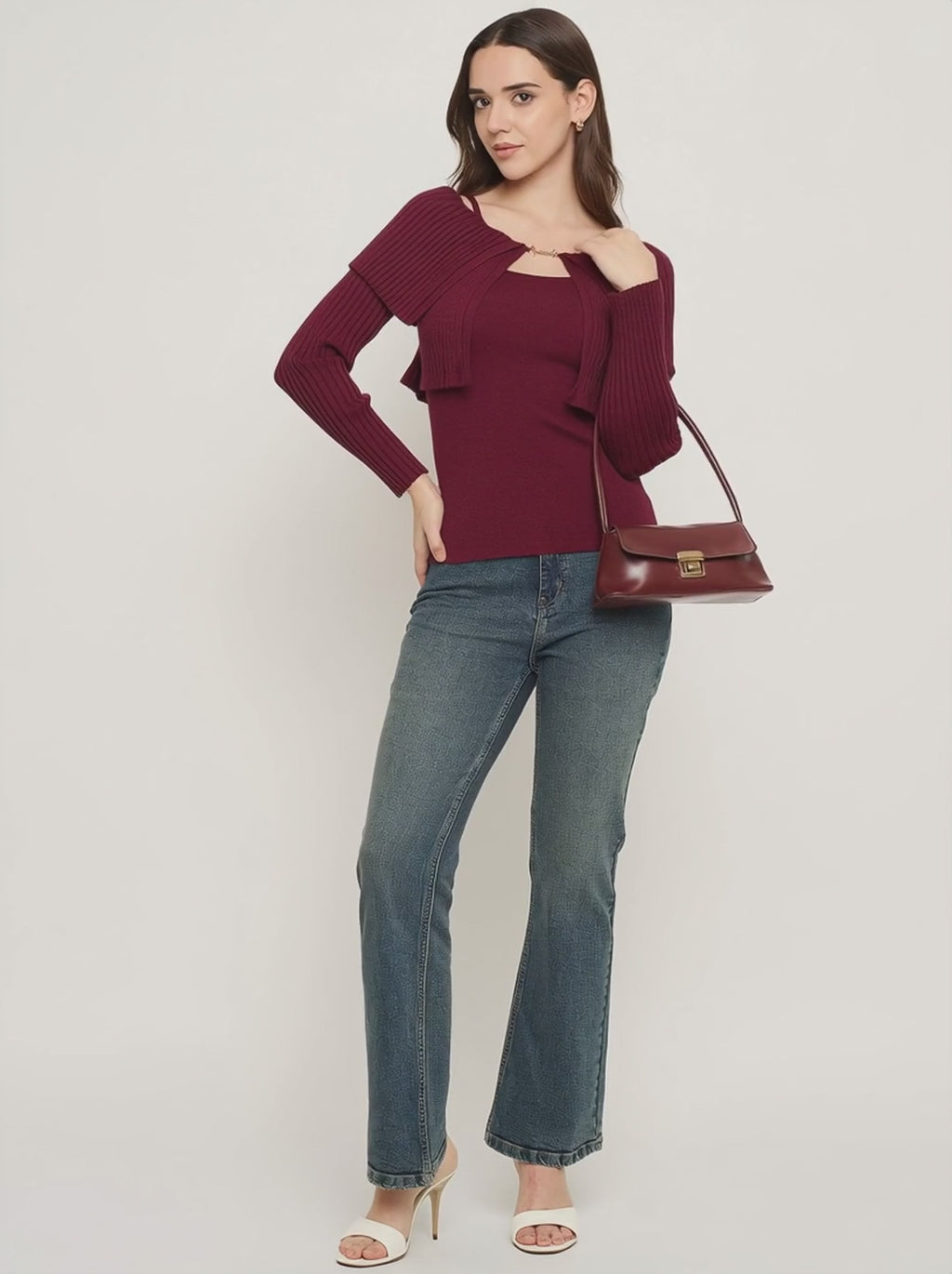 The Madame Twisted Ruffle Detail Wine Red Sweater features soft knit fabric, twisted ruffle detailing, and a relaxed fit in wine-red. Comfortable, stylish, and perfect for casual outings, everyday wear, and layering with skirts or trousers.