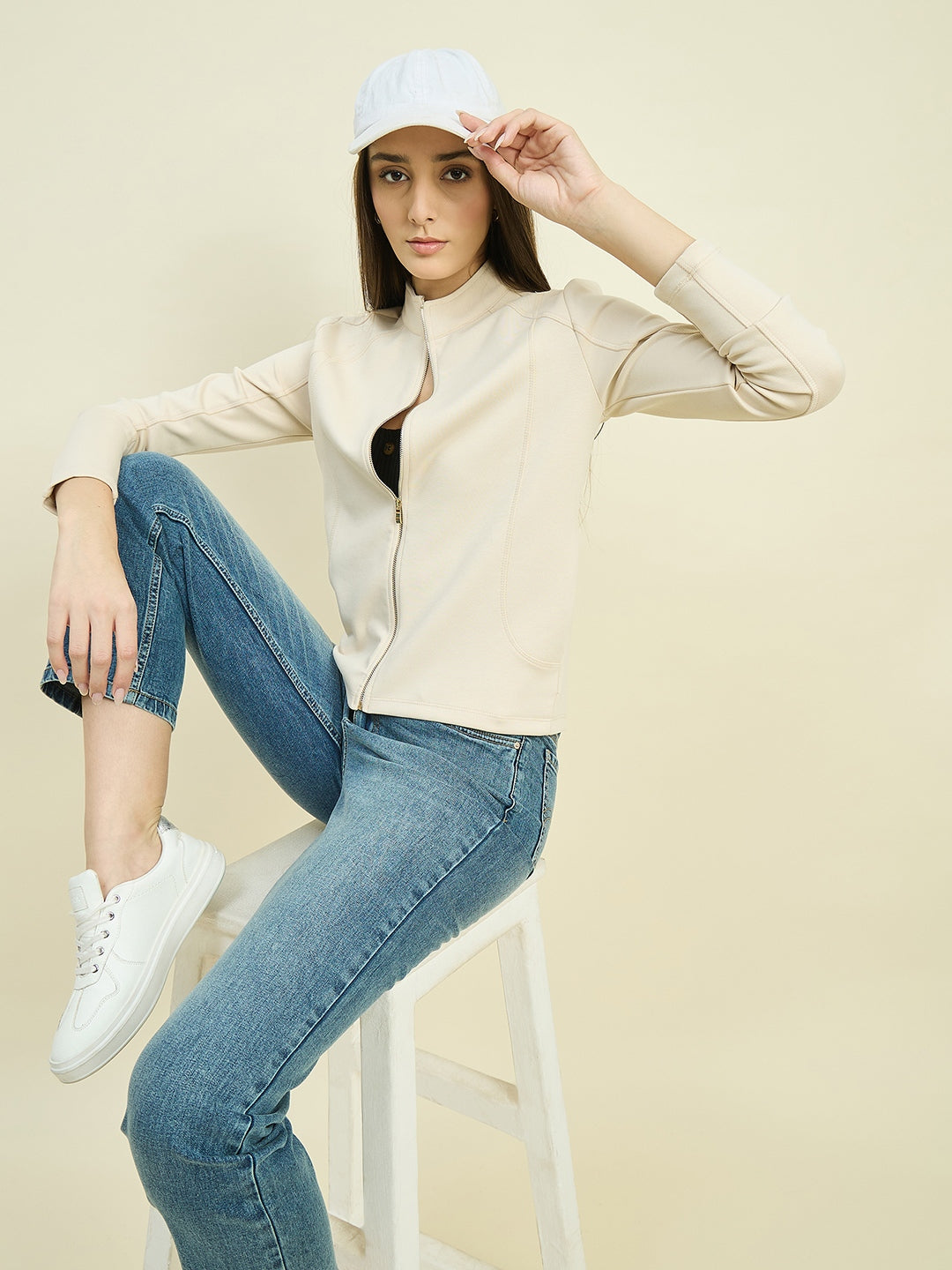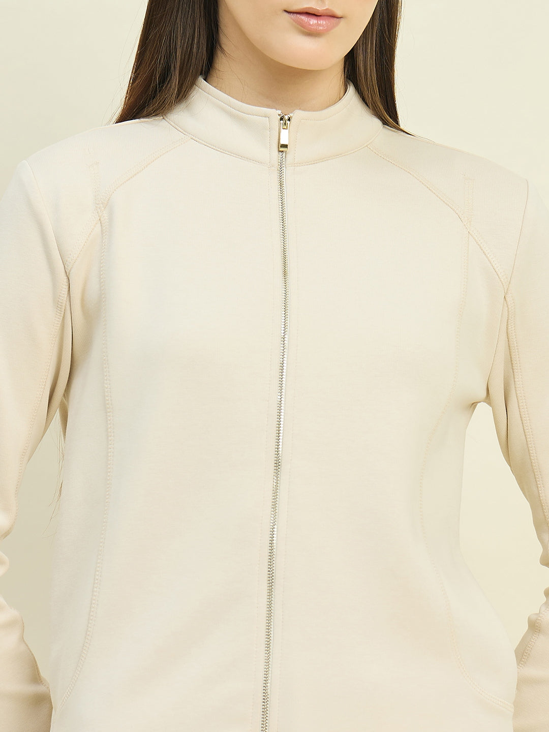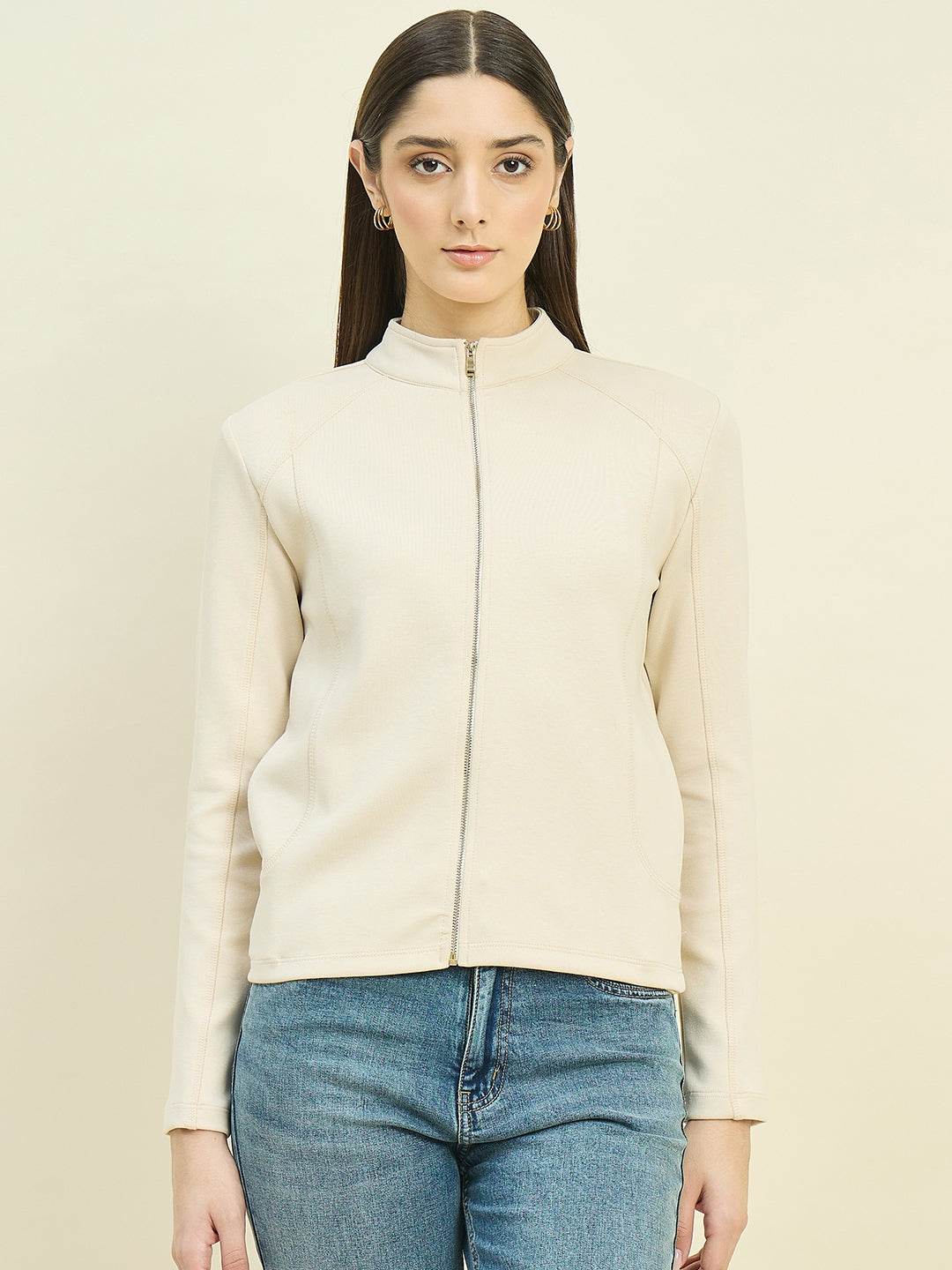 Keep it cozy and chic with Madame beige cotton blend mock neck sweatshirt. Soft, breathable, and relaxed in fit, it pairs effortlessly with jeans or trousers for a stylish, everyday casual look.