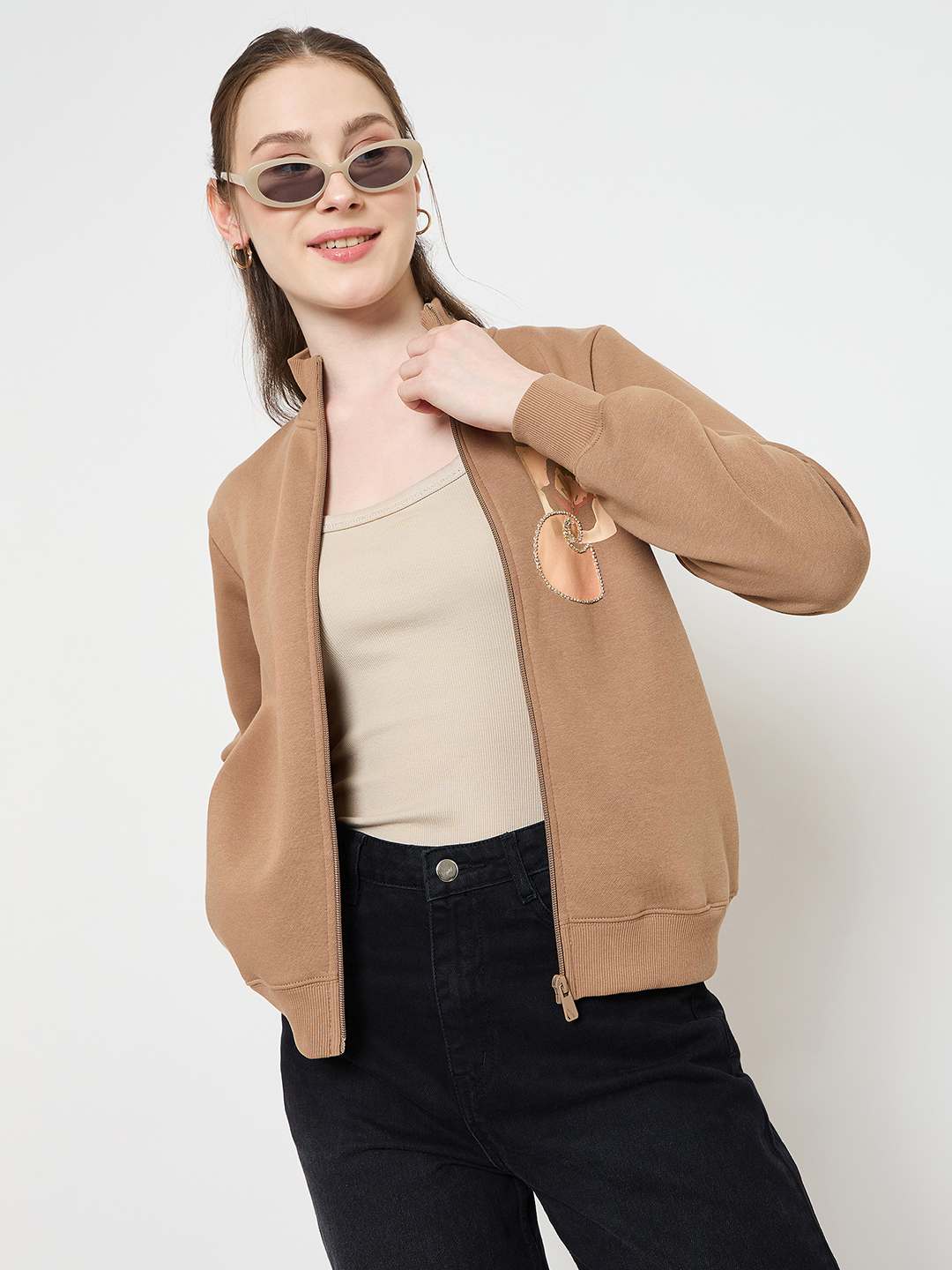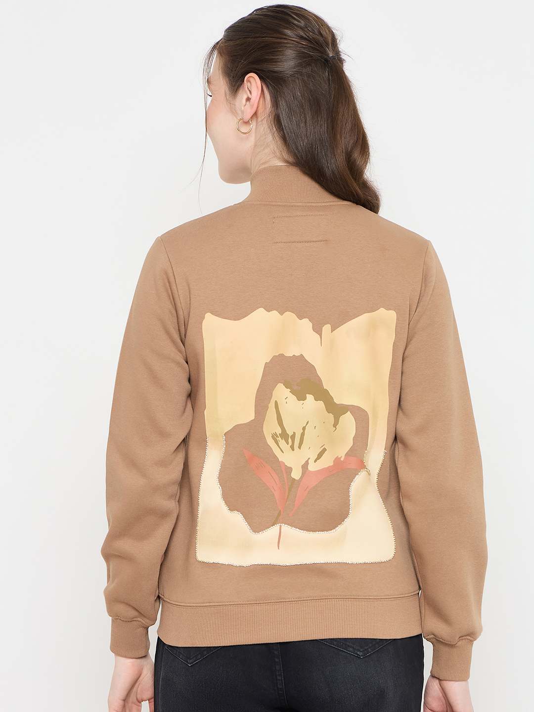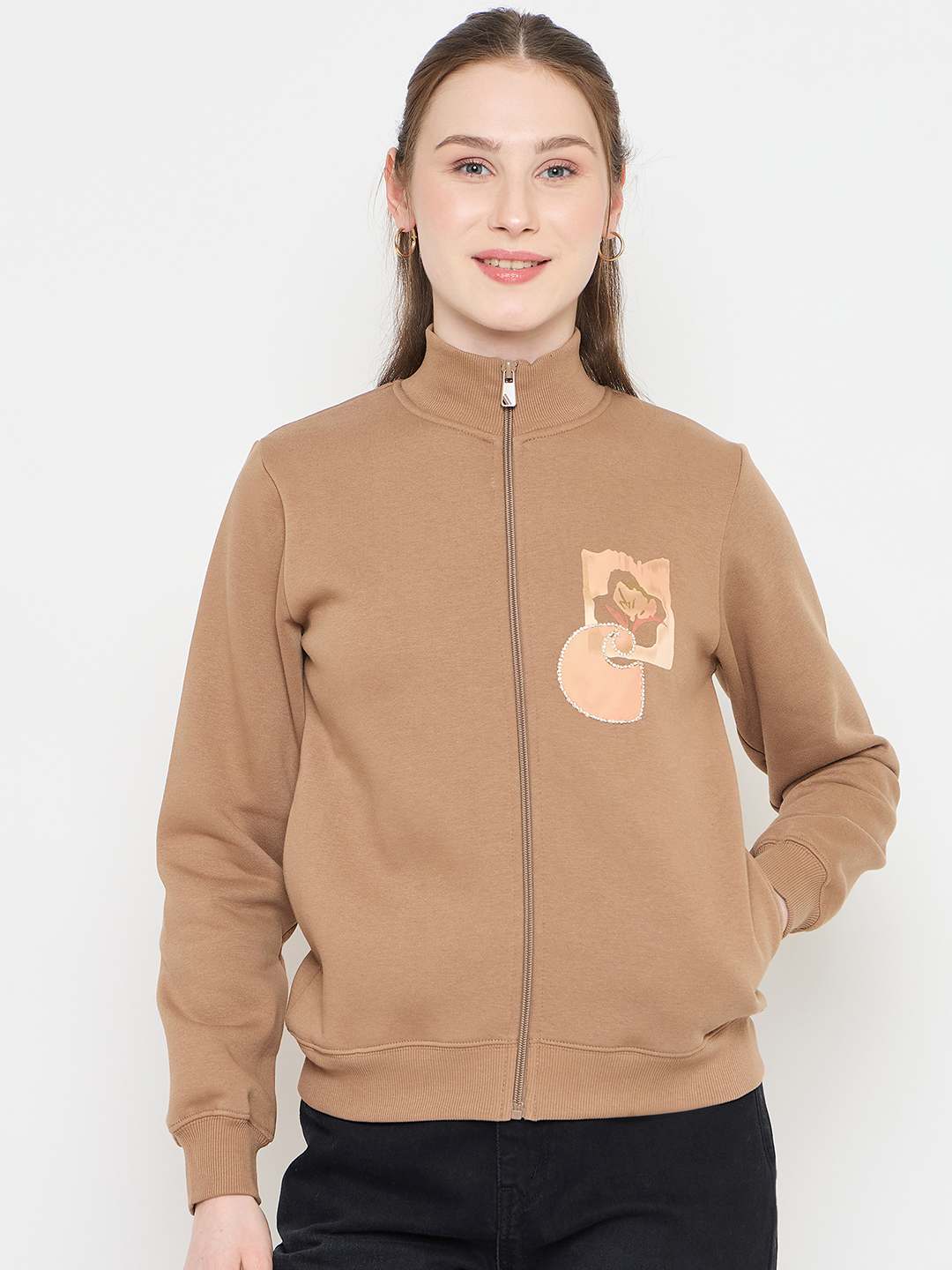 Madame Beige Mock Neck Sweatshirt for women featuring graphic print pocket patch, casual winter sweatshirt, mock neckline, trendy everyday wear.