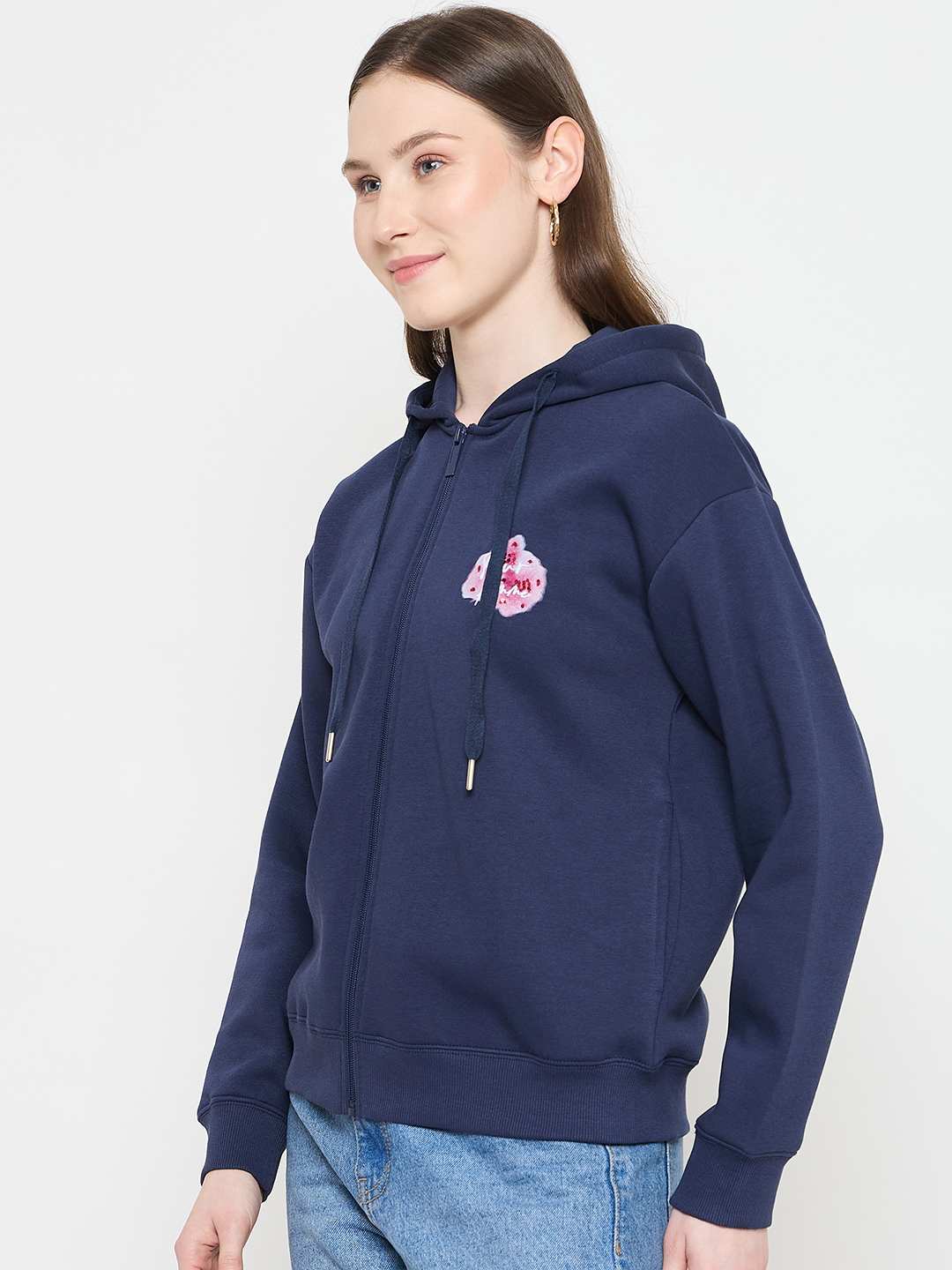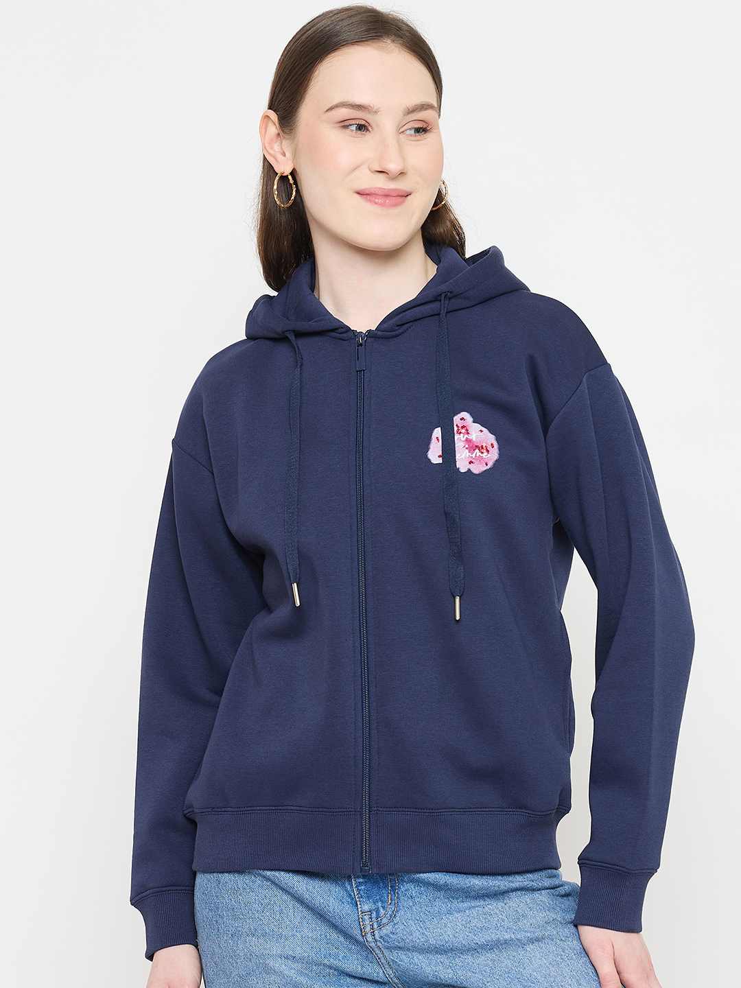 Elevate your casual wardrobe with this blue hooded sweatshirt from Madame. The front zipper and hood add versatility and style, while the soft fabric ensures all-day comfort—perfect for layering or wearing alone.