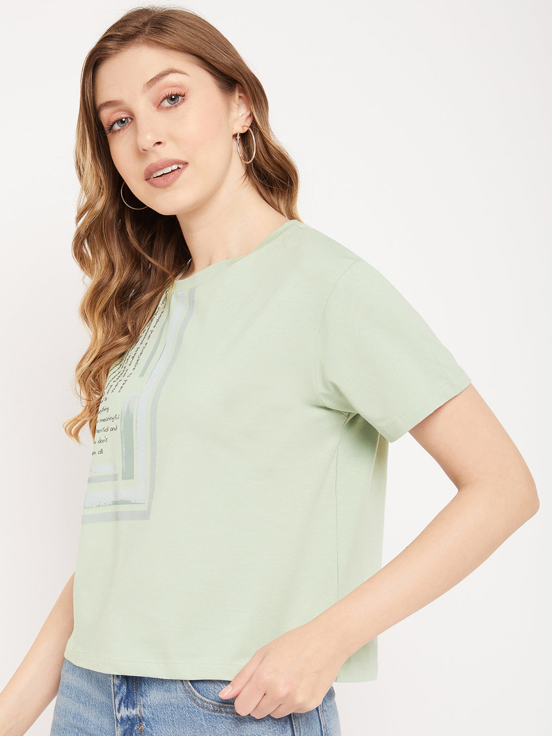 Kick start your wardrobe makeover with this super chill sea green cotton t-shirt. Oozing out a casual appeal, this women's t-shirt comes with a round neckline and typography prints at the front of the top. You can style this t-shirt with jeans or cargo pants and sneakers to create an uber-cool style statement.