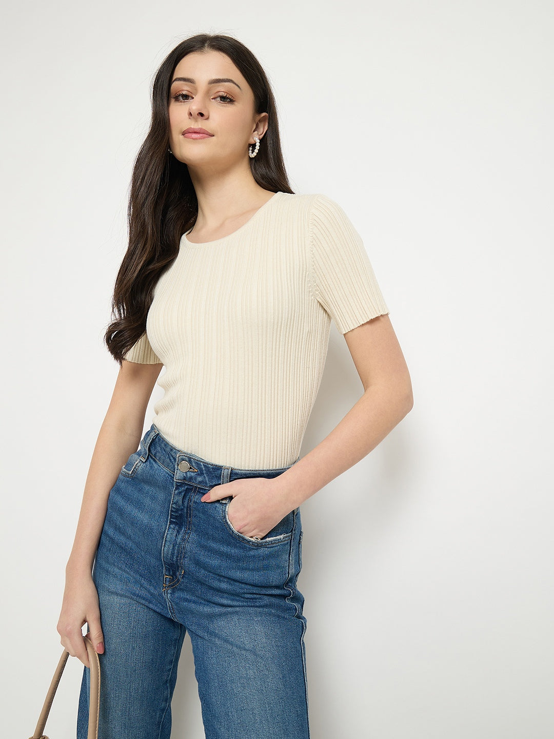 Madame Beige Viscose Blend Knitted T-Shirt