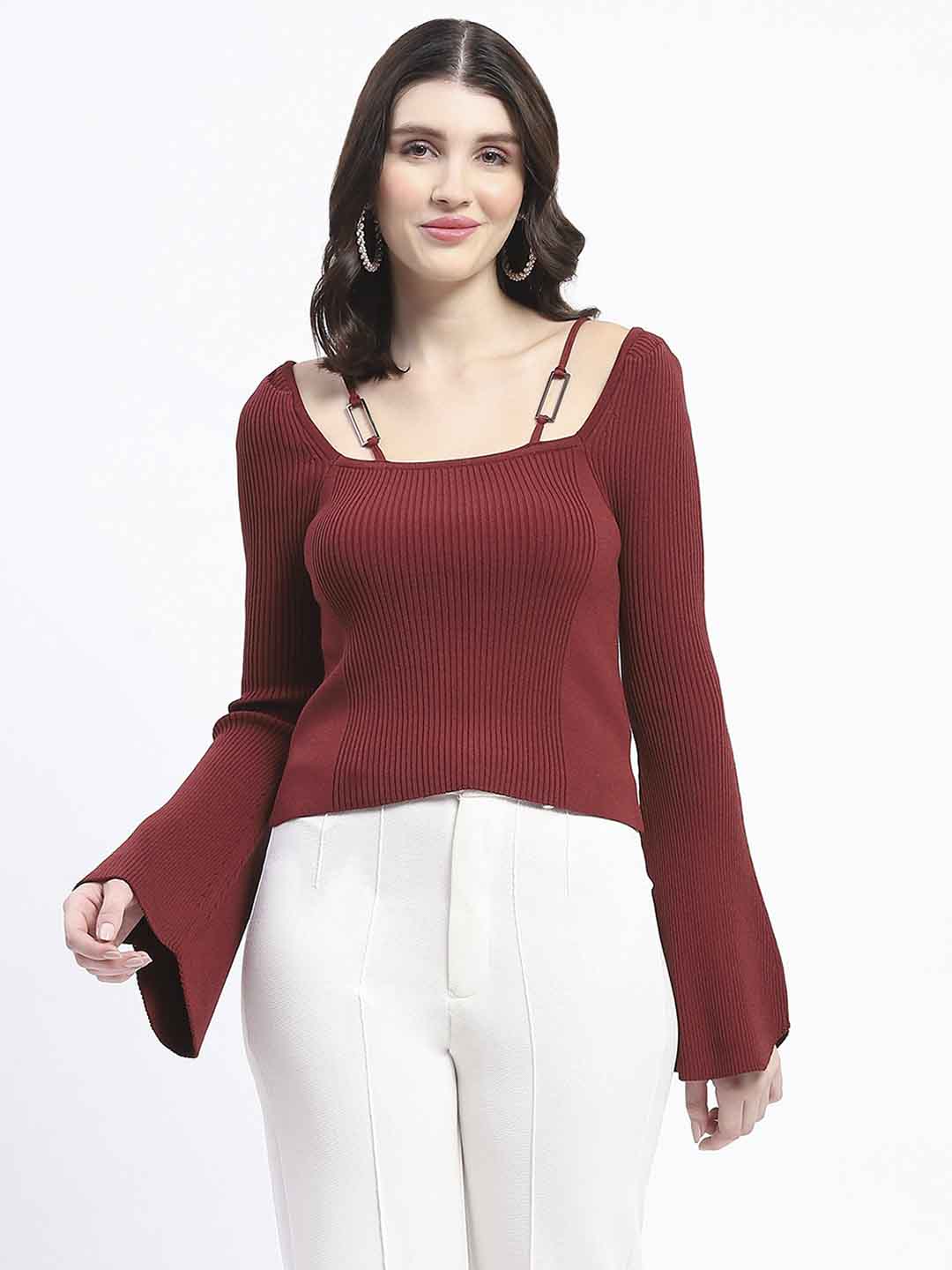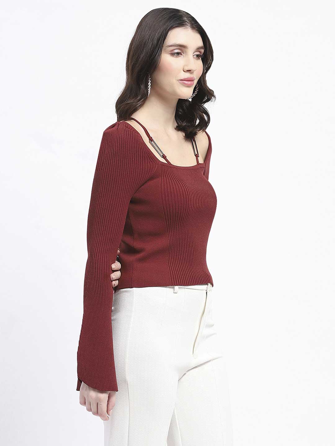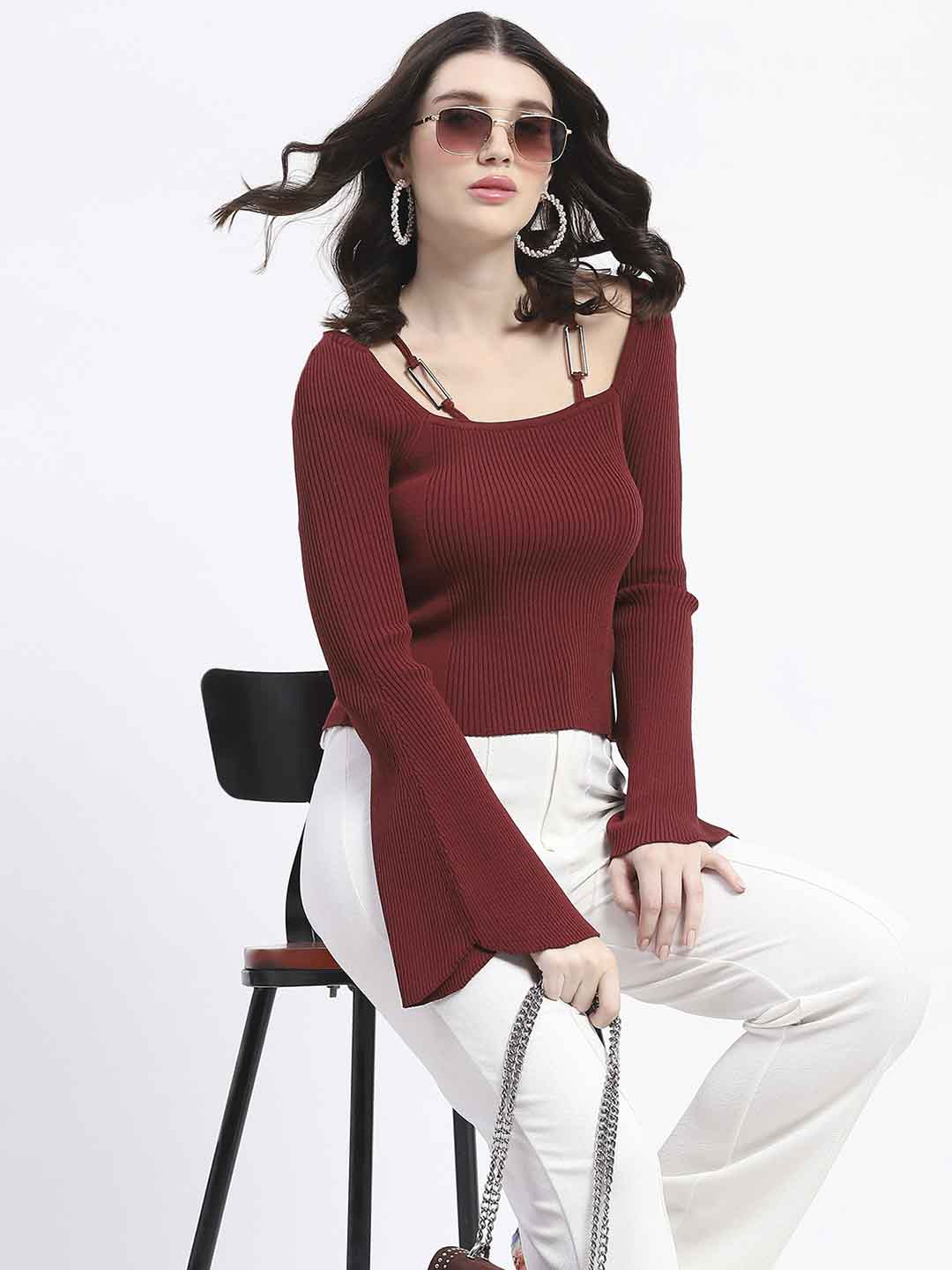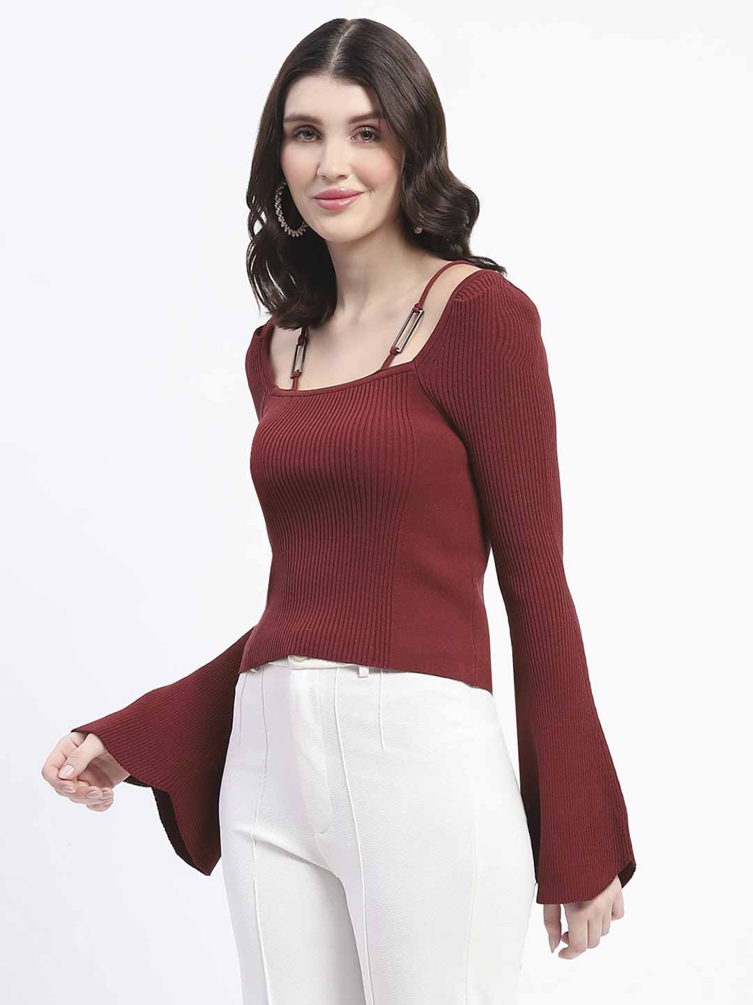 Madame Metal Accented Flounce Sleeve Red Knit Top