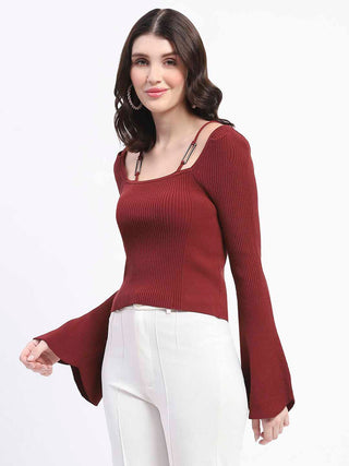 Madame Metal Accented Flounce Sleeve Red Knit Top