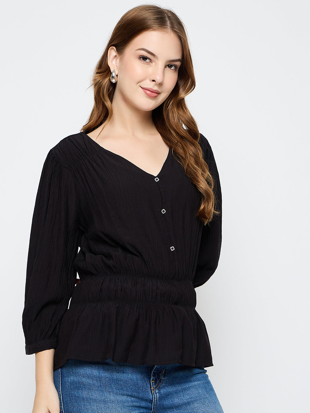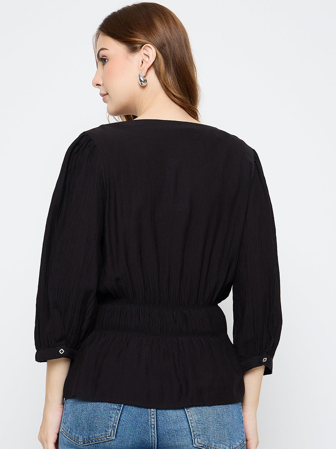 Sophisticated this black peplum top in a smooth rayon blend cinches at the waist. Ideal for after-work plans or a smart-casual outing, it’s a piece that transitions from desk to dinner.