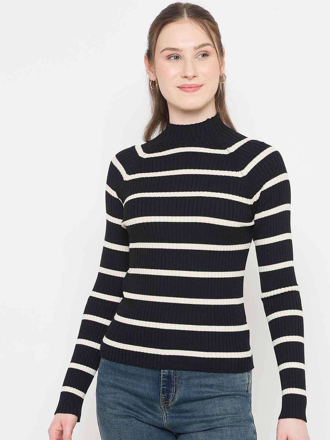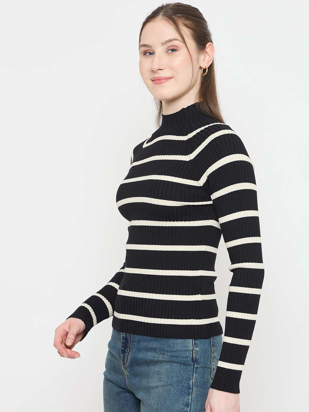 Chic and timeless, this striped mock neck knit top from Madame blends cozy comfort with refined style. The soft knit fabric and structured neckline make it perfect for layering or wearing solo for a smart, put-together look.