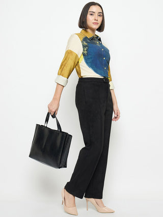Moving past basic polyester, choose high-quality crepe, known for its beautiful drape and subtle texture. Wide-leg trousers are in vogue however, choose them with purpose for formal settings. Don’t stick only to black trousers for women. Try a bold monochrome look with high-waist or paper bag waist styles. Also, wrinkle-resistant fabric is a smart choice for those last-minute meetings.