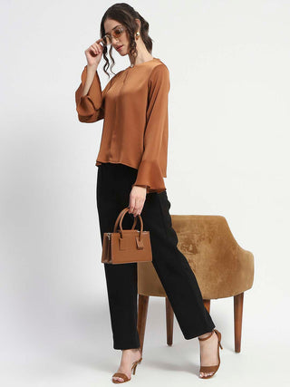 Madame Buckled Hem Warm Tan Rayon Blend Trousers