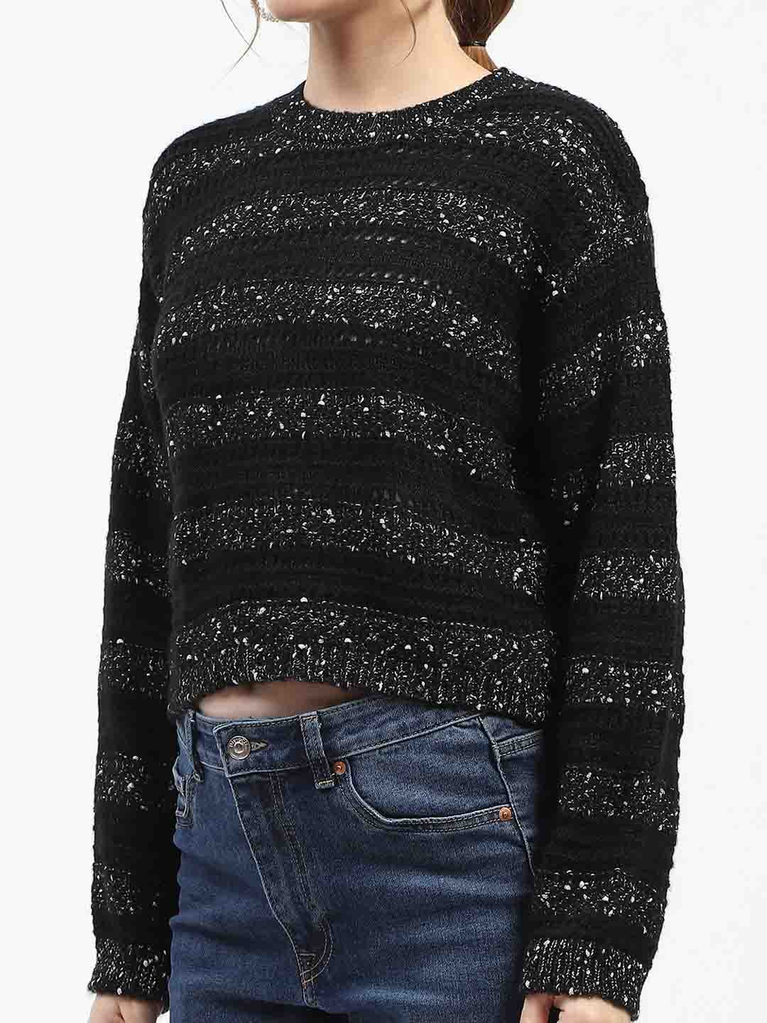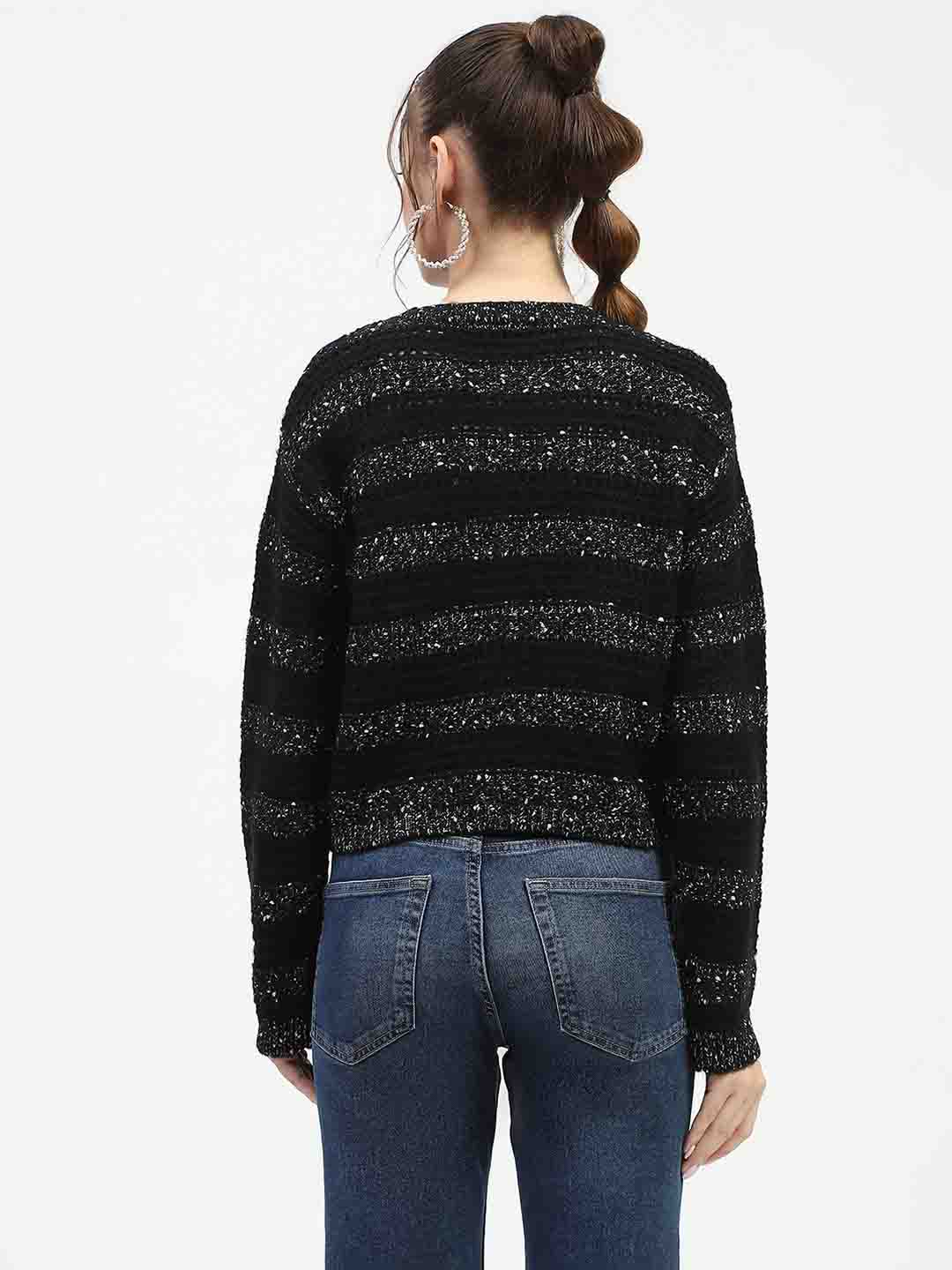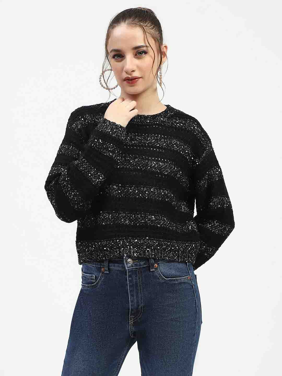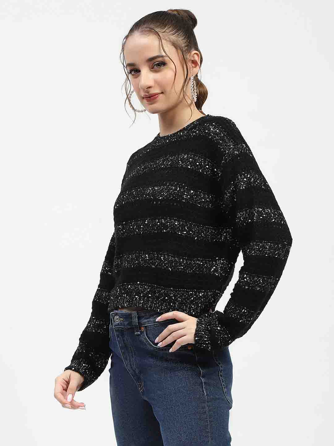 Madame Black Striped Cropped Sweater with Sparkle Detailing